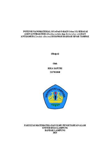 Rika , Sapitri (2025) POTENSI NANOMATERIAL S/CaO/nGO (0,625/1 dan 1/1) SEBAGAI AGEN ANTIBAKTERI (Bacillus subtilis DAN Escherichia coli) DAN ANTIJAMUR (Candida albicans) DI BAWAH IRADIASI SINAR TAMPAK. FAKULTAS MATEMATIKA DAN ILMU PENGETAHUAN ALAM, UNIVERSITAS LAMPUNG.