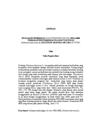 Yulia , Puspita Dewi (2025) PENGARUH PEMBERIAN POLY ETHYLENE GLYCOL (PEG) 6000 TERHADAP PERTUMBUHAN PLANLET KENTANG (Solanum tuberosum L.) KULTIVAR GRANOLA SECARA IN VITRO. FAKULTAS MATEMATIKA DAN ILMU PENGETAHUAN ALAM, UNIVERSITAS LAMPUNG.