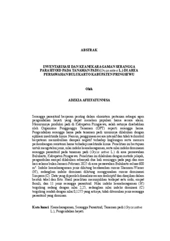 Serangga parasitoid berperan penting dalam ekosistem pertanian sebagai agen pengendalian hayati yang dapat menekan populasi hama secara alami. Menurunnya produksi padi di Kabupaten Pringsewu, salah satunya disebabkan oleh Organisme Pengganggu Tanaman (OPT) seperti serangga hama. Pengendalian serangga hama pada tanaman padi umumnya dilakukan dengan aplikasi insektisida kimia. Namun, penggunaan secara intensif dan tidak terkontrol berpotensi menimbulkan dampak negatif terhadap lingkungan serta memicu perkembangan resistensi hama terhadap insektisida kimia. Penelitian ini bertujuan untuk mengetahui jenis, nilai indeks keanekaragaman, serta nilai indeks dominansi serangga parasitoid pada tanaman padi (Oryza sativa L.) di area persawahan Bulukarto, Kabupaten Pringsewu. Penelitian ini dilakukan dengan metode jelajah, pengambilan sampel dilakukan sebanyak dua kali seminggu pada pagi dan sore hari selama bulan Januari-Februari 2025 di area persawahan Bulukarto seluas 600 m2. Indeks keanekaragaman jenis dihitung berdasarkan rumus Shannon-Wiener (H'), sedangkan indeks dominasi dihitung menggunakan rumus dominansi Simpson (C). Data yang diperoleh dianalisis secara deskriptif dan disajikan dalam bentuk tabel dan foto. Hasil penelitian menunjukkan terdapat satu ordo, empat famili, dan 11 jenis serangga parasitoid. Nilai indeks keanekaragaman (H') tergolong sedang dengan nilai 2,25, sedangkan nilai indeks dominasi (C) tergolong rendah dengan nilai 0,1275 yang artinya, tidak ditemukan jenis serangga parasitoid yang dominan. Kata kunci: Keanekaragaman, Serangga Parasitoid, Tanaman padi (Oryza sativa L.), Pengendalian hayati. Parasitoid insects play an important role in agricultural ecosystems as biological control agents that can suppress pest populations naturally. The decline in rice production in Pringsewu Regency is partly caused by plant-disturbing organisms (OPT) such as insect pests. Insect pests in rice plants are often controlled with chemical insecticides. However, excessive use of insecticides has the potential to damage the environment and cause resistance to pests. This study aims to determine the types, diversity index values, and dominance index values of parasitic insects in rice plants (Oryza sativa L.) in the Bulukarto rice field area, Pringsewu Regency. This study was conducted using the exploration method with sampling carried out twice a week in the morning and evening during January- February 2025 in the Bulukarto rice field area of 600 m2. The species diversity index was calculated based on the Shannon-Wiener formula (H ́), while the dominance index was calculated using the Simpson dominance formula (C). The data obtained were analyzed descriptively and presented in the form of tables and photos. The results showed that there were 1 order, 4 families, and 11 species of parasitoid insects. The H' value was classified as moderate with a value of 2.25, while the C value was classified as low with a value of 0.1275. Therefore, no dominant parasitoid insect species were found. Keywords: Biological control, Diversity, Parasitoid insects, Rice plant (Oryza sativa L.).