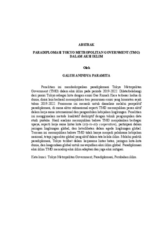Penelitian ini mendeskripsikan paradiplomasi Tokyo Metropolitan Government (TMG) dalam aksi iklim pada periode 2019-2022. Dilatarbelakangi dari posisi Tokyo sebagai kota dengan emisi Gas Rumah Kaca terbesar kedua di dunia, disisi lain berhasil menunjukkan tren penurunan emisi yang konsisten sejak tahun 2019-2022. Fenomena ini menarik untuk dianalisis melalui perspektif paradiplomasi, di mana aktor subnasional seperti TMG menunjukkan peran aktif dalam kerja sama internasional dan pengambilan kebijakan lingkungan. Penelitian ini menggunakan metode kualitatif deskriptif dengan teknik pengumpulan data studi pustaka. Hasil analisis menunjukkan bahwa TMG menjalankan berbagai upaya, seperti kerja sama lintas kota (city-to-city cooperation), partisipasi dalam jaringan lingkungan global, dan keterlibatan dalam ageda lingkungan global. Temuan ini menunjukkan bahwa TMG tidak hanya menjadi pelaksana kebijakan nasional, tetapi juga aktor global yang aktif dalam tata kelola iklim. Melalui praktik paradiplomasi, Tokyo terlibat dalam kerjasama lintas batas, jaringan kota-kota dunia, dan keagendaan global untuk mewujudkan aksi iklim global. Paradiplomasi aksi iklim TMG mencakup aksi iklim adaptasi dan juga aksi mitigasi. Kata kunci: Tokyo Metropolitan Government, Paradiplomasi, Perubahan iklim. This study describes the paradiplomacy of the Tokyo Metropolitan Government (TMG) in climate action in the period 2019-2022. Against the backdrop of Tokyo's position as the city with the second largest greenhouse gas emissions in the world, on the other hand, it has succeeded in showing a consistent trend of decreasing emissions since 2019-2022. This phenomenon is interesting to analyze through the perspective of paradiplomacy, where subnational actors such as TMG show an active role in international cooperation and environmental policy making. This study used a descriptive qualitative method with a literature study data collection technique. The results of the analysis show that TMG carries out various efforts, such as cross-city cooperation (city-to-city cooperation), participation in global environmental networks, and involvement in the global environmental agenda. These findings indicate that TMG is not only an implementer of national policies, but also an active global actor in climate governance. Through the practice of paradiplomacy, Tokyo is involved in cross-border cooperation, global city networks, and the global agendas to realize climate climate. The TMG's climate action paradiplomacy includes both adaptation and mitigation climate actions. Keywords: Tokyo Metropolitan Government, Paradiplomacy, Climate change.