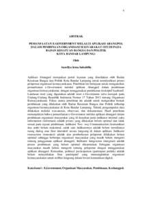 Aplikasi Abangpol merupakan portal layanan yang disediakan oleh Badan Kesatuan Bangsa dan Politik Kota Bandar Lampung untuk memfasilitasi proses pelaporan organisasi kemasyarakatan. Penelitian ini bertujuan untuk menganalisis pemanfaatan e-Government melalui aplikasi Abangpol dalam pembinaan organisasi kemasyarakatan, dengan menggunakan pendekatan deskriptif kualitatif. Landasan teori yang digunakan adalah teori e-Government serta merujuk pada Undang-Undang Republik Indonesia Nomor 17 Tahun 2013 tentang Organisasi Kemasyarakatan. Fokus utama penelitian ini adalah untuk mengetahui bentuk pembinaan yang dilakukan oleh Badan Kesatuan Bangsa dan Politik terhadap organisasi kemasyarakatan di Kota Bandar Lampung. Teknik pengumpulan data dilakukan melalui wawancara, observasi, dan dokumentasi. Hasil penelitian menunjukkan bahwa pemanfaatan e-Government melalui aplikasi abangpol dalam pembinaan organisasi masyarakat yang di dasarkan pada indikator internal yaitu information (informasi) adalah proses yang dilakukan belum optimal dan tidak sesuai pada tujuan pembinaan, indikator Two- way Communication (komunikasi dua arah) belum maksimal, salah satu indikatornya adalah belum tersedianya ruang dialog atau fitur interaktif secara langsung di dalam aplikasi. Indikator transaction (transaksi) adalah alur pemberkasan pelaporan dilakukan belum optimal sehingga beberapa organisasi masyarakat yang masih belum mengerti tentang penggunaan aplikasi abangpol. Indikator integration (integrasi) adalah proses pembinaan yang belum optimal dikarenakan Sebagian organisasi masyarakat masih belum mengerti tentang pelaporan dengan menggunakan aplikasi abangpol. Kemudian, political participation (partisipasi politik) adalah belum menyediakan fitur partisipatif yang memungkinkan organisasi kemasyarakatan untuk terlibat langsung dalam forum komunikasi digital. Kata kunci : E,Government, Organisasi Masyarakat, Pembinaan, Kesbangpol. The Abangpol application is a service portal provided by the National and Political Unity Agency (Badan Kesatuan Bangsa dan Politik) of Bandar Lampung City to facilitate the reporting process for community organizations. This study aims to analyze the utilization of e-Government through the Abangpol application in the development of community organizations by employing a descriptive qualitative approach. The theoretical foundation used is the theory of e- Government, with reference to the Law of the Republic of Indonesia Number 17 of 2013 concerning Community Organizations. The main focus of this research is to examine the forms of guidance provided by the National and Political Unity Agency to community organizations in Bandar Lampung City. Data collection techniques include interviews, observations, and documentation. The results of the study indicate that the implementation of e-Government through the Abangpol application in the development of community organizations, based on internal indicators, is not yet optimal. The information indicator shows that the process is not aligned with the intended objectives of organizational development. The two- way communication indicator has not been maximized, as evidenced by the absence of a direct dialogue space or interactive features within the application. The transaction indicator reveals that the document submission process is still suboptimal, causing several community organizations to lack understanding of how to use the Abangpol application. The integration indicator demonstrates that development efforts remain ineffective, as some organizations are still unfamiliar with the digital reporting system. Lastly, the political participation indicator reflects the lack of participatory features that would allow community organizations to actively engage in digital communication forums. Keywords : E-Government, Community Organizations, Development, Kesbangpol.