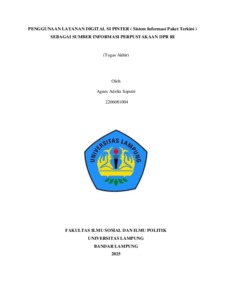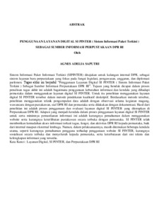 Sistem Informasi Paket Informasi Terkini (SIPINTER) ditujukan untuk kalangan internal DPR, sebagai sistem layanan baru perpustakaan yang fokus pada fungsi legislasi, pengawasan, anggaran, dan diplomasi parlemen. Tugas akhir ini berjudul “Penggunaan Layanan Digital SI PINTER ( Sistem Informasi Paket Terkini ) Sebagai Sumber Informasi Perpustakaan DPR RI”. Tujuan yang hendak dicapai dalam proses penulisan tugas akhir ini adalah bagaimana penggunaan kebutuhan informasi dan kendala yang dihadapi pemustaka dalam menggunakan layanan digital SI PINTER. Untuk itu penelitian menggunakan layanan digital SI PINTER tersebut dalam metode pendekatan kualitatif deskriptif. Berdasarkan metode tersebut, penelitian menggunakan teknik pengumpulan data adalah dengan observasi selama kegiatan magang, wawancara dengan pustakawan, staf DPR RI dan pemustaka serta dilakukan dengan dokumentasi. Hasil dari penelitian ini adalah proses penggunaan dan evaluasi layanan digital SI PINTER yang diterapkan di Perpustakaan DPR RI. Adapun yang menjadi kendala dalam proses penggunaan layanan digital SI PINTER untuk serta minimnya pemanfaatan informasi ini adalah kurangnya pemahaman dalam menggunakan website serta kurangnya keterlibatan pustakawan secara terbuka dengan pemustaka. SI PINTER telah memberikan kemudahan akses informasi terkait tugas, fungsi, dan aktivitas DPR RI kepada pemustaka, baik dari internal maupun eksternal lembaga. Namun, dalam pelaksanaannya, masih ditemukan beberapa kendala utama, seperti kurangnya pemahaman pengguna terhadap penggunaan website SI PINTER, kurangnya sosialisasi secara terbuka dan menyeluruh kepada pemustaka, serta keterbatasan dari sisi teknis dan kelengkapan informasi yang tersedia. Kata Kunci : Layanan Digital, SI PINTER, dan Perpustakaan DPR RI The Latest Information Package Information System (SIPINTER) is intended for internal DPR circles, as a new library service system that focuses on the functions of legislation, supervision, budgeting, and parliamentary diplomacy. This final project is entitled "Use of SI PINTER Digital Services (Latest Information Package System) as a Source of Information for the DPR RI Library". The objectives to be achieved in the process of writing this final project are how to use information needs and obstacles faced by librarians in using SI PINTER digital services. For this reason, the study uses the SI PINTER digital service in a descriptive qualitative approach method. Based on this method, the study uses data collection techniques such as observation during internship activities, interviews with librarians, DPR RI staff and librarians and is carried out with documentation. The results of this study are the process of using and evaluating SI PINTER digital services implemented in the DPR RI Library. The obstacles in the process of using SI PINTER digital services and the minimal use of this information are the lack of understanding in using the website and the lack of open involvement of librarians with librarians. SI PINTER has provided easy access to information related to the duties, functions, and activities of the DPR RI to librarians, both from internal and external institutions. However, in its implementation, several major obstacles were still found, such as a lack of user understanding regarding the use of the SI PINTER website, a lack of open and comprehensive socialization to librarians, as well as limitations in terms of technical aspects and the completeness of the information available. Keywords: Digital Services, SI PINTER, and DPR RI Library