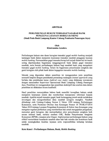 Perlindungan hukum atas dasar kerugian transaksi gagal mobile banking menjadi tantangan bank dalam menjamin keamanan transaksi nasabah pengguna layanan mobile banking. Permasalahan gagal transaksi kerap kali terjadi dalam hal ini masih sering dipertanyakan bagaimana tanggungjawab bank dalam gagal transaksi nasabah, serta bentuk perlindungan hukum bagi nasabah bank yang mengalami transaksi gagal mobile banking. Selain itu bagaimana penyelesaian sengketa dan ganti kerugian oleh pihak bank dalam kegagalan transaksi mobile banking. Metode yang digunakan dalam penelitian ini menggunakan jenis penelitian normatif empiris dengan pendekatan perundang-undangan (statute approach) yang berlaku dan pendekatan kasus (judicial case study) yang didukung wawancara dengan narasumber Supervisor Operasional Bank Lampung Cabang Panaragan Jaya. Penelitian ini menggunakan tipe penelitian deskriptif dan analisis data dalam penelitian ini dilakukan secara kualitatif. Hasil penelitian menunjukkan bahwa bank memiliki kewajiban hukum untuk menjamin keamanan sistem dan memberikan transparansi informasi kepada nasabah. Apabila terjadi transaksi gagal, bank bertanggung jawab untuk melakukan investigasi dan mengembalikan dana nasabah sesegera mungkin. Nasabah dilindungi oleh Undang-Undang Nomor 8 Tahun 1999 tentang Perlindungan Konsumen, serta Peraturan Otoritas Jasa Keuangan Nomor 18 /POJK.07/2018 Tahun 2018 tentang Layanan Pengaduan Konsumen di Sektor Jasa Keuangan yang mengatur regulasi perbankan yang memberikan hak untuk mengajukan pengaduan, menuntut ganti kerugian, dan memanfaatkan jalur penyelesaian sengketa baik secara internal bank, melalui mediasi OJK, Badan Penyelesaian Sengketa Konsumen (BPSK), maupun jalur litigasi. Implementasi perlindungan hukum yang efektif memerlukan kesadaran nasabah akan hak-hak mereka dan komitmen bank untuk meningkatkan kualitas layanan serta responsibilitas terhadap keluhan nasabah. Kata Kunci : Perlindungan Hukum, Bank, Mobile Banking. Legal protection on the basis of losses from failed mobile banking transactions is a challenge for banks in ensuring the security of transactions for customers using mobile banking services. The problem of failed transactions often occurs in this case, it is still often questioned how the bank is responsible for failed customer transactions, as well as the form of legal protection for bank customers who experience failed mobile banking transactions. In addition, how is the dispute resolution and compensation by the bank in failed mobile banking transactions. The method used in this study is a normative empirical research type with a statute approach and a judicial case study approach supported by interviews with the Operational Supervisor of Bank Lampung, Panaragan Jaya Branch. This study uses a descriptive research type and data analysis in this study was conducted qualitatively. The results of the study indicate that banks have a legal obligation to ensure system security and provide transparency of information to customers. If a transaction fails, the bank is responsible for conducting an investigation and returning customer funds as soon as possible. Customers are protected by Law Number 8 of 1999 concerning Consumer Protection, as well as Financial Services Authority Regulation Number 18 / POJK.07 / 2018 of 2018 concerning Consumer Complaints Services in the Financial Services Sector which regulates banking regulations that provide the right to file complaints, claim compensation, and utilize dispute resolution channels both internally at the bank, through OJK mediation, the Consumer Dispute Resolution Agency (BPSK), or litigation channels. Effective implementation of legal protection requires customer awareness of their rights and the bank's commitment to improving the quality of service and responsiveness to customer complaints. Keywords: Legal Protection, Bank, Mobile Banking.