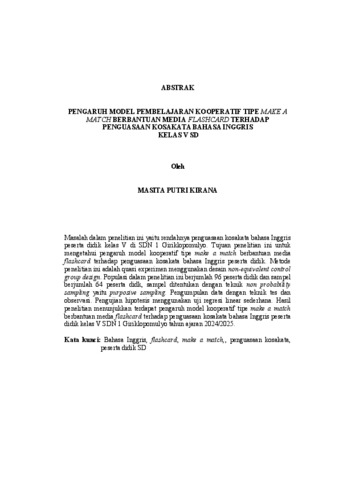Masita Putri Kirana, - (2025) PENGARUH MODEL PEMBELAJARAN KOOPERATIF TIPE MAKE A MATCH BERBANTUAN MEDIA FLASHCARD TERHADAP PENGUASAAN KOSAKATA BAHASA INGGRIS KELAS V SD. FAKULTAS KEGURUAN DAN ILMU PENDIDIKAN, UNIVERSITAS LAMPUNG.