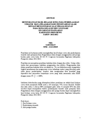 Penelitian ini bertujuan untuk meningkatkan hasil belajar siswa ada pembelajaran tematik mata pelajaran Ilmu Pengetahuan Alam dengan menggunakan alat peraga buatan pada siswa kelas III SD N I Lugusari kecamatan Pagelaran kabupaten Pringsewu tahun 2011/2012. Penelitan ini merupakan penelitian tindakan kelas dengan dua siklus. Setiap siklus terdiri dari perencanaan, tindakan, pengamatan, dan refleksi. Pengumpulan data dalam penelitian tindakan kelas ini adalah tes. Tes ini dilakukan untuk mengetahui tingkat pemahaman dan penguasaan siswa terhadapa materi yang diberikan pada akhir proses pembelajaran. Analisis data mengunakan data kuantitaf yang diperoleh dari prosentase banyaknya siswa yang telah memenuhi nilai KKM dengan rumus P= × × 100%. Indikator keberhasilan yang diharapkan dalam penelitian ini adalah hasil belajar siswa telah memenuhi KKM yaitu ≥ 63 mencapai 75% secara klasikal. Dilihat dari data siklus I sebesar 60% meningkat pada siklus II menjadi 85% dari data tersebut dapat disimpulkan bahwa pembelajaran tematik mata pelajaran Ilmu Pengetahuan Alam dengan menggunakan alat peraga buatan dapat meningkatkan hasil belajar siswa kelas III SD N I Lugusari kecamatan Pagelaran kabupaten Pringsewu tahun 2011/2012. Kata kunci: 1. Hasil belajar siswa 2. Pembelajaran tematik 3. Alat peraga buatan