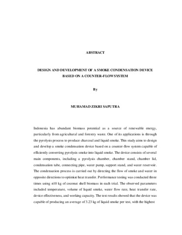 Indonesia memiliki potensi biomassa yang melimpah sebagai sumber energi terbarukan, terutama dari limbah pertanian dan kehutanan. Salah satu pemanfaatannya adalah melalui proses pirolisis untuk menghasilkan arang dan asap cair. Penelitian ini bertujuan untuk merancang dan membangun alat kondensasi asap berbasis sistem counter flow yang mampu mengubah asap hasil pirolisis menjadi asap cair secara efisien. Alat ini terdiri dari beberapa komponen utama, yaitu tabung pirolisis, kaki tabung pirolisis, tutup tabung pirolisis, tabung kondensasi, pipa penghubung, pompa air, tiang penyangga dan bak penampung air. Proses kondensasi dilakukan dengan mengalirkan asap dan air dalam arah berlawanan untuk mengoptimalkan perpindahan panas. Uji kinerja dilakukan sebanyak tiga kali menggunakan bahan baku batok kelapa sebanyak ±10 kg dalam tiap percobaan. Parameter yang diamati meliputi suhu, volume asap cair, debit air, laju perpindahan panas, efektivitas alat, dan kapasitas kerja. Hasil pengujian menunjukkan bahwa alat mampu menghasilkan asap cair rata-rata sebesar3,23 kg per pengujian, dengan laju perpindahan panas tertinggi mencapai 51,30 watt. Sistem counter flow terbukti meningkatkan efisiensi kondensasi dan efektivitas alat dalam menghasilkan produk yang bernilai ekonomis sekaligus mengurangi pencemaran lingkungan. Penelitian ini menggunakan sistem aliran berlawanan dalam desain kondensor untuk optimasi produksi asap cair dari biomassa. Kata Kunci: alat kondensasi asap, sistem counter flow, pirolisis, asap cair, biomassa.