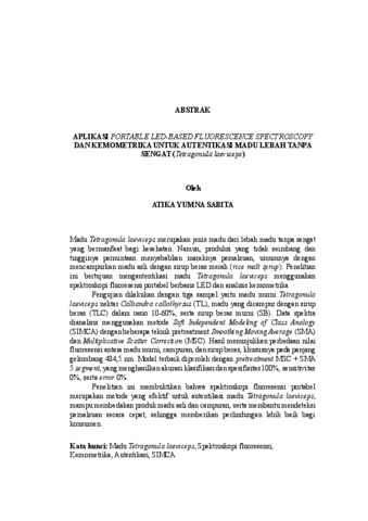 Atika Yumna Sabita, - (2025) APLIKASI PORTABLE LED-BASED FLUORESCENCE SPECTROSCOPY DAN KEMOMETRIKA UNTUK AUTENTIKASI MADU LEBAH TANPA SENGAT (Tetragonula laeviceps). FAKULTAS PERTANIAN, UNIVERSITAS LAMPUNG.