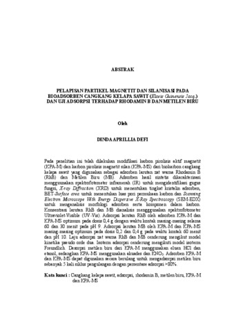 Dinda, Aprillia Defi (2025) PELAPISAN PARTIKEL MAGNETIT DAN SILANISASI PADA BIOADSORBEN CANGKANG KELAPA SAWIT (Elaeis Guinensis Jacq.) DAN UJI ADSORPSI TERHADAP RHODAMIN B DAN METILEN BIRU. FAKULTAS MATEMATIKA DAN ILMU PENGETAHUAN ALAM, UNIVERSITAS LAMPUNG.