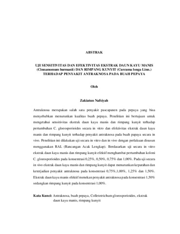 Zakiatun , Nafsiyah (2025) UJI SENSITIVITAS DAN EFEKTIVITAS EKSTRAK DAUN KAYU MANIS (Cinnamomum burmanii) DAN RIMPANG KUNYIT (Curcuma longa Linn.) TERHADAP PENYAKIT ANTRAKNOSA PADA BUAH PEPAYA. FAKULTAS PERTANIAN, UNIVERSITAS LAMPUNG.
