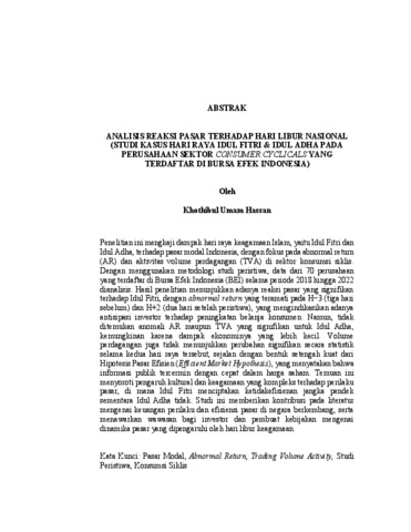 Penelitian ini mengkaji dampak hari raya keagamaan Islam, yaitu Idul Fitri dan Idul Adha, terhadap pasar modal Indonesia, dengan fokus pada abnormal return (AR) dan aktivitas volume perdagangan (TVA) di sektor konsumsi siklis. Dengan menggunakan metodologi studi peristiwa, data dari 70 perusahaan yang terdaftar di Bursa Efek Indonesia (BEI) selama periode 2018 hingga 2022 dianalisis. Hasil penelitian menunjukkan adanya reaksi pasar yang signifikan terhadap Idul Fitri, dengan abnormal return yang teramati pada H−3 (tiga hari sebelum) dan H+2 (dua hari setelah peristiwa), yang mengindikasikan adanya antisipasi investor terhadap peningkatan belanja konsumen. Namun, tidak ditemukan anomali AR maupun TVA yang signifikan untuk Idul Adha, kemungkinan karena dampak ekonominya yang lebih kecil. Volume perdagangan juga tidak menunjukkan perubahan signifikan secara statistik selama kedua hari raya tersebut, sejalan dengan bentuk setengah kuat dari Hipotesis Pasar Efisien (Efficient Market Hypothesis), yang menyatakan bahwa informasi publik tercermin dengan cepat dalam harga saham. Temuan ini menyoroti pengaruh kultural dan keagamaan yang kompleks terhadap perilaku pasar, di mana Idul Fitri menciptakan ketidakefisienan jangka pendek sementara Idul Adha tidak. Studi ini memberikan kontribusi pada literatur mengenai keuangan perilaku dan efisiensi pasar di negara berkembang, serta menawarkan wawasan bagi investor dan pembuat kebijakan mengenai dinamika pasar yang dipengaruhi oleh hari libur keagamaan. Kata Kunci: Pasar Modal, Abnormal Return, Trading Volume Activity, Studi Peristiwa, Konsumsi Siklis This study examines the impact of Islamic religious holidays Eid al-Fitr and Eid al-Adha on the Indonesian capital market, focusing on abnormal returns (AR) and trading volume activity (TVA) in the consumer cyclicals sector. Using an event study methodology, data from 70 companies listed on the Indonesia Stock Exchange (IDX) from 2018 to 2022 were analyzed. The results indicate a significant market reaction to Eid al-Fitr, with abnormal returns observed on H−3 (three days before) and H+2 (two days after the event), suggesting investor anticipation of increased consumer spending. However, no significant AR or TVA anomalies were detected for Eid al-Adha, likely due to its lesser economic impact. Trading volumes showed no statistically significant changes during either holiday, aligning with the semi-strong form of the Efficient Market Hypothesis (EMH), which posits that public information is rapidly reflected in stock prices. These findings highlight the nuanced influence of cultural and religious events on market behavior, with Eid al-Fitr generating short-term inefficiencies while Eid al-Adha does not. The study contributes to the literature on behavioral finance and market efficiency in emerging economies, offering insights for investors and policymakers on holiday-driven market dynamics. Kata Kunci: Capital Market, Abnormal Return, Trading Volume Activity, Event Study, Consummer Cyclical