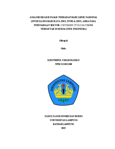 KHOTHIBUL, UMAM HASSAN (2025) ANALISIS REAKSI PASAR TERHADAP HARI LIBUR NASIONAL (STUDI KASUS HARI RAYA IDUL FITRI & IDUL ADHA PADA PERUSAHAAN SEKTOR CONSUMER CYCLICALS YANG TERDAFTAR DI BURSA EFEK INDONESIA). FAKULTAS EKONOMI DAN BISNIS, UNIVERSITAS LAMPUNG.