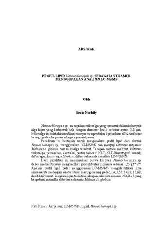 Nannochloropsis sp. merupakan mikroalga yang termasuk dalam kelompok alga hijau yang berbentuk bola dengan diameter kecil, berkisar antara 2-8 μm. Mikroalga ini telah diidentifikasi mampu memproduksi lipid sekitar 60% dari berat keringnya dan berperan sebagai agen antijamur. Penelitian ini bertujuan untuk menganalisis profil lipid dari ekstrak Nannochloropsis sp. menggunakan LC-MS/MS dan menguji aktivitas antijamur Malassezia globosa dari mikroalga tersebut. Tahapan metode meliputi kultivasi mikroalga, pemanenan, ekstraksi, partisi cair-cair, KLT, KLT-Bioautografi kontak, difusi agar, kromatografi kolom, difusi cakram dan analisis LC-MS/MS. Hasil penelitian ini menunjukkan bahwa kultivasi Nannochloropsis sp. dalam media Conway menghasilkan produktivitas biomassa sebesar 1,55 gL−1d−1. Analisis profil lipid polar menggunakan LC-MS/MS mengidentifikasi lima senyawa utama dengan waktu retensi masing-masing pada 5,14; 5,55; 14,83; 15,68; dan 16,69 menit. Senyawa lipid terdeteksi dengan nilai m/z sebesar 792,6127 yang berpotensi memiliki aktivitas antijamur Malassezia globosa. Kata Kunci: Antijamur, LC-MS/MS, Lipid, Nannochloropsis sp. Nannochloropsis sp. is a microalgae included in the group of green algae that is spherical with a small diameter, ranging from 2-8 μm. This microalgae has been identified as being able to produce lipids of around 60% of its dry weight and acts as an antifungal agent. This study aims to analyze the lipid profile of Nannochloropsis sp. extract using LC-MS/MS and test the antifungal activity of Malassezia globosa the microalgae. The method stages include microalgae conversion, harvesting, extraction, liquid-liquid partition, TLC, TLC- Bioautography contact, agar diffusion, column chromatography, disc diffusion and LC-MS/MS analysis. The results of this study indicate that the damage of Nannochloropsis sp. in Conway media resulted in biomass productivity of 1.55 gL−1d−1. Analysis of the polar lipid profile using LC-MS/MS detected five main compounds with retention times of 5.14; 5.55; 14.83; 15.68; and 16.69 minutes, respectively. Lipid compounds were detected with an m/z value of 792.6127 which has the potential to have antifungal activity against Malassezia globosa. Keywords: Antifungal, LC-MS/MS, Lipids, Nannochloropsis sp.