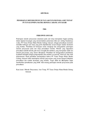Penerapan metode penyusutan akuntansi pada aset tetap merupakan bagian penting dalam laporan keuangan yang mencerminkan penurunan nilai aset seiring berjalannya waktu. PT Tunas Dwipa Matra Honda Cabang Antasari, sebagai perusahaan otomotif, memiliki berbagai aset tetap yang perlu diperlakukan sesuai dengan standar akuntansi yang berlaku. Penelitian ini bertujuan untuk mengkaji dan menganalisis penerapan metode penyusutan pada aset tetap perusahaan tersebut. Metode yang digunakan perusahaan adalah metode garis lurus (straight-line method), yang merupakan salah satu metode penyusutan yang umum diterapkan. Penelitian ini menggunakan pendekatan kualitatif deskriptif dengan pengumpulan data melalui wawancara, observasi, dan studi dokumentasi. Hasil penelitian menunjukkan bahwa PT Tunas Dwipa Matra Honda Cabang Antasari telah menerapkan metode penyusutan yang sesuai dengan kebijakan perusahaan dan standar akuntansi yang berlaku. Tugas akhir ini diharapkan dapat memberikan pemahaman yang lebih baik tentang penerapan metode penyusutan pada perusahaan. Kata kunci : Metode Penyusutan, Aset Tetap, PT Tunas Dwipa Matra Honda Cabang Antasari. The application of accounting depreciation methods to fixed assets is an important part of financial statements that reflect the decline in asset value over time. PT Tunas Dwipa Matra Honda Antasari Branch, as an automotive company, has various fixed assets that need to be treated in accordance with applicable accounting standards. This study aims to examine and analyze the application of depreciation methods on the company's fixed assets. The method used by the company is the straight-line method, which is one of the commonly applied depreciation methods. This study uses a descriptive qualitative approach with data collection through interviews, observations, and documentation studies. The results of the study indicate that PT Tunas Dwipa Matra Honda Cabang Antasari has applied a depreciation method that is in accordance with company policy and applicable accounting standards. This final project is expected to provide a better understanding of the application of depreciation methods in companies. Keywords: Depreciation Method, Fixed Assets, PT Tunas Dwipa Matra Honda Cabang Antasari.