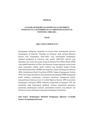 Aqil Usman Hermawan , - (2025) ANALISIS DETERMINAN KETIMPANGAN DISTRIBUSI PENDAPATAN: UJI PEMBERLAKUAN HIPOTESIS KUZNET DI INDONESIA (2004-2023). FAKULTAS EKONOMI DAN BISNIS, UNIVERSITAS LAMPUNG.