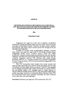 Penggunaan jamu pegal linu secara luas di Indonesia menimbulkan kekhawatiran terhadap penambahan bahan kimia obat (BKO) seperti metamizol yang dapat membahayakan kesehatan. Metamizol merupakan senyawa analgesik dan antipiretik yang efektif, namun memiliki potensi efek samping serius jika digunakan tanpa pengawasan. Penelitian ini bertujuan untuk mengidentifikasi kandungan metamizol dalam sampel jamu pegal linu yang beredar di Kota Bandar Lampung dengan menggunakan metode Fourier Transform Infrared (FTIR) dan analisis kemometrika. Sebanyak sembilan sampel jamu diperoleh dari toko jamu dan pasar tradisional, serta dibuat jamu referensi dari bahan herbal seperti kunyit, jahe, dan temulawak. Pengukuran spektrum FTIR dilakukan pada rentang bilangan gelombang 4000–650 cm−1, kemudian dianalisis secara kualitatif menggunakan Principal Component Analysis (PCA) dan secara kuantitatif menggunakan Partial Least Square (PLS). Hasil PCA menunjukkan bahwa sebagian besar sampel memiliki pola spektrum yang serupa dengan jamu referensi, kecuali satu sampel yaitu JH 4 yang menunjukkan kemiripan dengan spektrum metamizol. Model PLS yang dibangun dari set kalibrasi menunjukkan nilai koefisien determinasi (R2) sebesar 0,999797 dan nilai RMSEC sebesar 1,42%, sedangkan pada set validasi diperoleh R2 sebesar 0,99986 dan RMSEP sebesar 0,0672%, yang menunjukkan tingkat akurasi prediksi yang tinggi. Penelitian ini membuktikan bahwa kombinasi metode FTIR dan kemometrika efektif untuk mendeteksi keberadaan dan kadar metamizol secara cepat, akurat, dan ramah lingkungan. Kata Kunci: Metamizol, jamu pegal linu, FTIR, kemometrika, PCA, PLS The widespread use of jamu pegal linu (herbal medicine for muscle aches) in Indonesia has raised concerns over the addition of pharmaceutical chemicals (BKO) such as metamizole, which can pose health risks. Metamizole is an effective analgesic and antipyretic compound but carries the potential for serious side effects when used without supervision. This study aims to identify the presence of metamizole in jamu pegal linu samples available in Bandar Lampung using Fourier Transform Infrared (FTIR) spectrophotometry combined with chemometric analysis. Nine samples were obtained from herbal stores and traditional markets, and reference jamu was prepared using herbal ingredients such as turmeric, ginger, and temulawak. FTIR spectral measurements were conducted in the range of 4000–650 cm−1, then analyzed qualitatively using Principal Component Analysis (PCA) and quantitatively using Partial Least Squares (PLS). PCA results showed that most samples had spectral patterns similar to the reference jamu, except for one sample, JH 4, which closely resembled the metamizole spectrum. The PLS model built from the calibration set yielded a coefficient of determination (R2) of 0.999797 and an RMSEC of 1.42%, while the validation set showed an R2 of 0.99986 and an RMSEP of 0.0672%, indicating high prediction accuracy. This study demonstrates that the combination of FTIR and chemometric methods is effective for rapidly, accurately, and environmentally-friendly detection of the presence and concentration of metamizole. Keywords: Metamizole, jamu pegal linu, FTIR, chemometrics, PCA, PLS