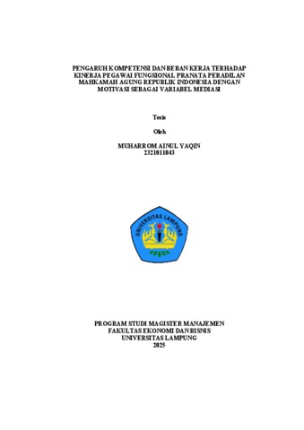 MUHARROM , AINUL YAQIN (2025) PENGARUH KOMPETENSI DAN BEBAN KERJA TERHADAP KINERJA PEGAWAI FUNGSIONAL PRANATA PERADILAN MAHKAMAH AGUNG REPUBLIK INDONESIA DENGAN MOTIVASI SEBAGAI VARIABEL MEDIASI. Masters thesis, UNIVERSITAS LAMPUNG .