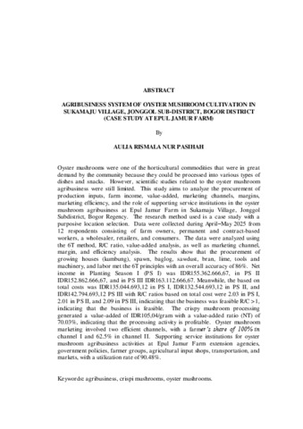 SISTEM AGRIBISNIS JAMUR TIRAM DI DESA SUKAMAJU KECAMATAN JONGGOL KABUPATEN BOGOR (STUDI KASUS EPUL JAMUR FARM)