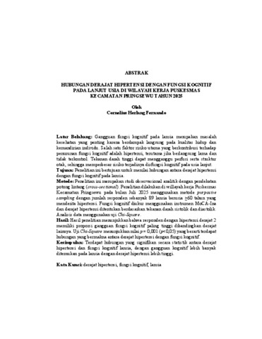 Cornelius , Herlang Fernando (2025) HUBUNGAN DERAJAT HIPERTENSI DENGAN FUNGSI KOGNITIF PADA LANJUT USIA DI WILAYAH KERJA PUSKESMAS KECAMATAN PRINGSEWU TAHUN 2025. FAKULTAS KEDOKTERAN, UNIVERSITAS LAMPUNG.