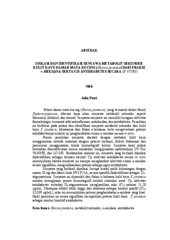 Pohon damar mata kucing (Shorea javanica), yang termasuk dalam famili Dipterocarpaceae, dikenal kaya akan senyawa metabolit sekunder seperti flavonoid, alkaloid, dan steroid. Senyawa-senyawa ini memiliki beragam aktivitas farmakologis, termasuk sifat antiinflamasi, antioksidan, dan antidiabetes. Penelitian ini berfokus pada isolasi dan identifikasi senyawa metabolit sekunder dari kulit kayu S. javanica, khususnya dari fraksi n-heksana, serta mengevaluasi potensi antidiabetesnya melalui uji penghambatan enzim α-amilase secara in vitro. Proses perolehan senyawa diawali dengan ekstraksi kulit kayu menggunakan metode maserasi dengan pelarut metanol, diikuti fraksinasi dan pemurnian menggunakan teknik kromatografi kolom. Senyawa hasil isolasi kemudian dikarakterisasi secara mendalam menggunakan spektroskopi UV-Vis, 1H-NMR, dan LC-MS. Berdasarkan analisis ini, senyawa yang berhasil diisolasi diidentifikasi sebagai turunan steroid. Uji aktivitas antidiabetes secara in vitro menunjukkan bahwa senyawa ini mampu menghambat aktivitas enzim α-amilase secara signifikan, mengindikasikan potensi sebagai agen antidiabetes. Senyawa yang berhasil diisolasi, berupa kristal putih kekuningan dengan massa 20 mg dan diberi kode NVJ F21A, secara spesifik diidentifikasi sebagai D4- stigmasterone. Senyawa ini diperoleh dari fraksi n-heksana kulit kayu S. javanica melalui serangkaian proses kromatografi setelah ekstraksi awal. Uji aktivitas antidiabetes terhadap D4-stigmasterone menghasilkan nilai IC50 sebesar 51,58 μg/mL. Meskipun sedikit lebih tinggi dari akarbosa sebagai kontrol positif (IC50 32,039 μg/mL), nilai ini menunjukkan potensi penghambatan α-amilase yang kuat. Hasil penelitian ini secara signifikan memperkuat potensi kulit kayu S. javanica sebagai sumber bioaktif antidiabetes. Kata kunci: Shorea javanica, metabolit sekunder, α-amilase, antidiabetes. Damar mata kucing (Shorea javanica), a species belonging to the Dipterocarpaceae family, is renowned for its rich content of secondary metabolites such as flavonoids, alkaloids, and steroids. These compounds exhibit diverse pharmacological activities, including anti-inflammatory, antioxidant, and antidiabetic properties. This study focused on isolating and identifying secondary metabolites from S. javanica bark, particularly from the n-hexane fraction, and evaluating their antidiabetic potential through in vitro α-amylase enzyme inhibition assays. The compound isolation process began with the extraction of the bark using maceration with methanol as the solvent, followed by fractionation and purification using column chromatography techniques. The isolated compound was then thoroughly characterized using UV-Vis spectroscopy, 1H-NMR, and LC-MS. Based on these analyses, the successfully isolated compound was identified as a steroid derivative. In vitro antidiabetic activity tests demonstrated that this compound significantly inhibited α-amylase enzyme activity, indicating its potential as an antidiabetic agent. The isolated compound, a yellowish-white crystal with a mass of 20 mg and designated as NVJ F21A, was specifically identified as D4-stigmasterone. This compound was obtained from the n-hexane fraction of S. javanica bark through a series of chromatographic processes after initial extraction. Antidiabetic activity testing of D4-stigmasterone yielded an IC50 value of 51.58 μg/mL. Although slightly higher than acarbose, the positive control (IC50 32.039 μg/mL), this value indicates strong α-amylase inhibition potential. The findings of this research significantly reinforce the potential of S. javanica bark as a source of antidiabetic bioactive compounds. Keywords: Shorea javanica, secondary metabolites, α-amylase, antidiabetic