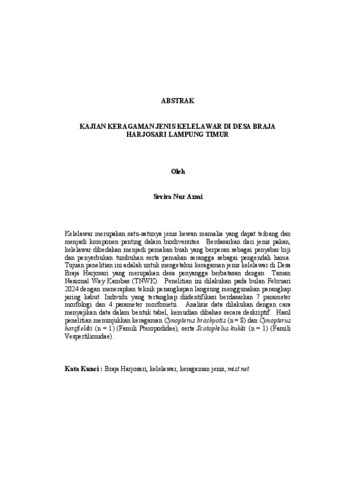 Sevira Nur Azmi, - (2025) KAJIAN KERAGAMAN JENIS KELELAWAR DI DESA BRAJA HARJOSARI LAMPUNG TIMUR. FAKULTAS MATEMATIKA DAN ILMU PENGETAHUAN ALAM, UNIVERSITAS LAMPUNG.