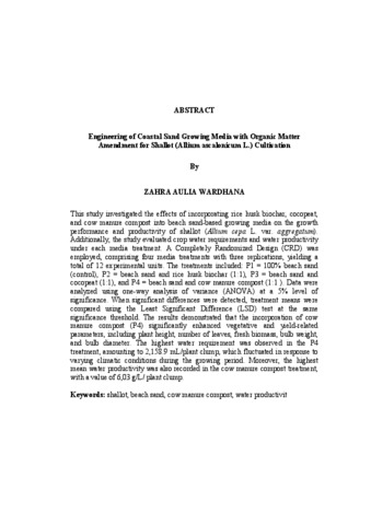 Penelitian ini bertujuan untuk menganalisis pengaruh penambahan sekam bakar, cocopeat dan kompos kotoran sapi terhadap pertumbuhan dan produktivitas tanaman bawang merah, serta menganalisis kebutuhan air tanaman dan produktivitas air tanaman bawang merah di media pasir dan campurannya. Penelitian ini menggunakan Rancangan Acak Lengkap (RAL) dengan 4 taraf perlakuan dan 3 ulangan sehingga terdapat 12 satuan percobaan. Taraf perlakuan yang digunakan ialah P1 = 100% media pasir pantai, P2 = pasir pantai dan sekam bakar (1:1), P3 = pasie pantai dan cocopeat (1:1), P4 = pasir pantai dan kompos kotoran sapi (1:1). Data hasil penelitian dianalisis menggunakan analisis sidik ragam (anova) pada jenjang nyata 5%. Perlakuan yang berbeda nyata diuji lanjut dengan BNT pada jenjang nyata 5%. Hasil penelitian menunjukkan kombinasi terbaik terjadi pada penambahan kompos kotoran sapi pada parameter tinggi tanaman, jumlah daun, bobot segar tanaman, bobot umbi, dan diameter umbi tanaman bawang merah. Kebutuhan air tanaman tertinggi terjadi pada penambahan kompos kotoran sapi yaitu sebesar 2158,9 ml/rumpun tanaman dan cenderung fluktiatif akibat kondisi cuaca. Rata-rata produktivitas air tertinggi terdapat pada kombinasi penambahan kompos kotoran sapi sebesar 6,03 g/L per rumpun tanaman. Kata kunci: bawang merah, pasir pantai, kompos kotoran sapi, produktivitas air This study investigated the effects of incorporating rice husk biochar, cocopeat, and cow manure compost into beach sand-based growing media on the growth performance and productivity of shallot (Allium cepa L. var. aggregatum). Additionally, the study evaluated crop water requirements and water productivity under each media treatment. A Completely Randomized Design (CRD) was employed, comprising four media treatments with three replications, yielding a total of 12 experimental units. The treatments included: P1 = 100% beach sand (control), P2 = beach sand and rice husk biochar (1:1), P3 = beach sand and cocopeat (1:1), and P4 = beach sand and cow manure compost (1:1 ). Data were analyzed using one-way analysis of variance (ANOVA) at a 5% level of significance. When significant differences were detected, treatment means were compared using the Least Significant Difference (LSD) test at the same significance threshold. The results demonstrated that the incorporation of cow manure compost (P4) significantly enhanced vegetative and yield-related parameters, including plant height, number of leaves, fresh biomass, bulb weight, and bulb diameter. The highest water requirement was observed in the P4 treatment, amounting to 2,158.9 mL/plant clump, which fluctuated in response to varying climatic conditions during the growing period. Moreover, the highest mean water productivity was also recorded in the cow manure compost treatment,
