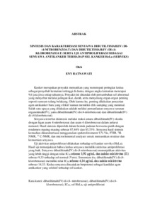 Kanker merupakan penyakit mematikan yang menempati peringkat kedua sebagai penyebab kematian tertinggi di dunia, dengan angka kematian mencapai 9,6 juta jiwa setiap tahunnya. Penyakit ini ditandai oleh pertumbuhan sel abnormal yang menyebar melalui jaringan ikat, darah, serta menyerang organ-organ penting seperti sumsum tulang belakang. Oleh karena itu, penting dilakukan pencarian agen antikanker baru yang efektif namun memiliki efek samping yang minimal. Salah satu upaya yang dilakukan adalah melalui pemanfaatan senyawa turunan organotimah(IV), yaitu dibutiltimah(IV) di-(4-nitrobenzoat) dan dibutiltimah(IV) di-(4-klorobenzoat). Senyawa tersebut disintesis melalui reaksi antara dibutiltimah(IV) oksida dengan ligan asam 4-nitrobenzoat dan asam 4-klorobenzoat dalam pelarut metanol. Hasil sintesis diperoleh dalam bentuk padatan berwarna putih dengan rendemen masing-masing sebesar 87,44% dan 85,53%. Senyawa hasil sintesis kemudian dikarakterisasi menggunakan spektrofotometer UV-Vis, FTIR, 1H- NMR, 13 C-NMR, dan microelemental analyzer untuk memastikan struktur dan kemurnian senyawa. Uji aktivitas antiproliferasi dilakukan terhadap sel kanker serviks (HeLa). Hasil uji menunjukkan bahwa kedua senyawa memiliki aktivitas antiproliferasi yang baik. Senyawa dibutiltimah(IV) di-(4-nitrobenzoat) menunjukkan aktivitas yang lebih tinggi dengan nilai IC50 sebesar 3,90 μg/mL dan indeks selektivitas (IS) sebesar 9,33 terhadap sel normal (Vero). Sementara itu, dibutiltimah(IV) di-(4- klorobenzoat) memiliki nilai IC50 sebesar 4,34 μg/mL dan indeks selektivitas sebesar 14,33. Kedua senyawa dinyatakan berpotensi sebagai kandidat agen antikanker yang selektif terhadap sel kanker. Kata kunci: dibutiltimah(IV) di-(4- nitrobenzoat), dibutiltimah(IV) di-(4- klorobenzoat), IC50, sel HeLa, uji antiproliferasi Cancer is a deadly disease that ranks second as the leading cause of death worldwide, with 9.6 million deaths each year. The disease is characterized by abnormal cell growth that spreads through connective tissue, blood, and invades important organs such as the spinal cord. Therefore, it is important to look for new anticancer agents that are effective yet have minimal side effects. One of the efforts made is through the utilization of organotin (IV) derived compounds, namely dibutyltin (IV) di-(4-nitrobenzoate) and dibutyltin (IV) di-(4- chlorobenzoate). This compound was synthesized through the reaction between dibutyltin (IV) oxide with 4-nitrobenzoic acid and 4-chlorobenzoic acid ligands in methanol solvent. The synthesis results obtained are white solids with yields of 87.44% and 85.53%, respectively. The synthesized compounds were then characterized using UV-Vis spectrophotometer, FTIR, 1H-NMR, 13 C-NMR, and microelement analysis to ensure the structure and purity of the compounds. Antiproliferation activity test was conducted on cervical cancer cells (HeLa). The test results show that both compounds have good antiproliferation activity. Dibutiltin(IV) di-(4-nitrobenzoate) compound showed higher activity with IC50 value of 3.90 μg/mL and selectivity index (IS) of 9.33 against normal cells (Vero). Meanwhile, dibutyltin (IV) di-(4-chlorobenzoate) had an IC50 value of 4.34 μg/mL and a selectivity index of 14.33. Both compounds were found to have potential as anticancer agent candidates that are selective to cancer cells. Key words: antiproliferation assay, dibutyltin(IV) di-(4-nitrobenzoate), dibutyltin(IV) di-(4-chlorobenzoate), HeLa cells), IC50