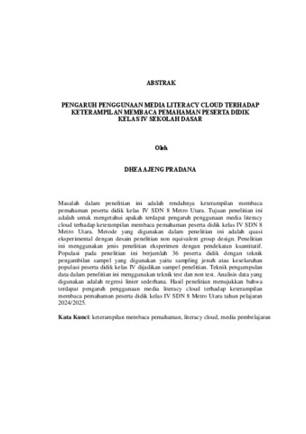 DHEA , AJENG PRADANA (2025) PENGARUH PENGGUNAAN MEDIA LITERACY CLOUD TERHADAP KETERAMPILAN MEMBACA PEMAHAMAN PESERTA DIDIK KELAS IV SEKOLAH DASAR. FAKULTAS KEGURUAN DAN ILMU PENDIDIKAN, UNIVERSITAS LAMPUNG.