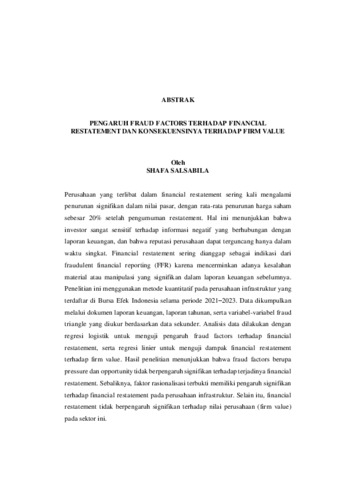SHAFA , SALSABILA (2025) PENGARUH FRAUD FACTORS TERHADAP FINANCIAL RESTATEMENT DAN KONSEKUENSINYA TERHADAP FIRM VALUE. FAKULTAS EKONOMI DAN BISNIS, UNIVERSITAS LAMPUNG.