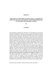 The processing of mackerel into fish jerky was one method used to preserve mackerel. The addition of coriander at varying concentrations affected the sensory properties of the fish jerky, thus requiring an appropriate concentration to produce jerky preferred by consumers. The objective of this study was to examine the effect of coriander concentration on the moisture content, ash content, and sensory properties of mackerel fish jerky, and to determine the optimal concentration that produced moisture and ash contents in accordance with the Indonesian National Standard (SNI) while achieving the best sensory characteristics. The study was designed using a Completely Randomized Block Design (CRBD) with a single factor, namely the addition of coriander at six levels: 0 g, 1 g, 2 g, 3 g, 4 g, and 5 g, with four replications. The collected data were analyzed using analysis of variance (ANOVA) to assess the effect between treatments. When a significant difference was detected, the data were further analyzed using the Least Significant Difference (LSD) test at the 5% significance level. The results showed that the addition of coriander did not significantly affect the texture but significantly influenced the moisture content, ash content, and sensory attributes (taste, aroma, and color) of the mackerel jerky, as indicated by F calculated > F table at α = 5%. The optimal concentration of coriander was 3 g, which resulted in a moisture content of 15.79%, ash content of 6.18%, fat content of 7.20%, and protein content of 35.02%, all complying with SNI 8645:2018 standards. The jerky produced at this concentration exhibited a distinctive savory coriander flavor, a characteristic coriander aroma, a brown color, and a firm texture typical of jerky. Keywords : Jerky, mackerel, coriander, moisture content, ash content Pengolahan ikan kembung menjadi dendeng ikan merupakan salah satu cara yang digunakan untuk mengawetkan ikan kembung. Penambahan konsentrasi ketumbar berpengaruh terhadap sifat sensori dendeng ikan sehingga diperlukan konsentrasi yang tepat agar didapatkan dendeng ikan yang disukai oleh konsumen. Tujuan penelitian ini yaitu mengetahui pengaruh konsentrasi ketumbar terhadap kadar air, kadar abu dan sifat sensori dendeng ikan kembung, menentukan konsentrasi ketumbar terbaik yang menghasilkan kadar air, kadar abu sesuai SNI dan sifat sensori dendeng ikan kembung terbaik. Penelitian ini disusun dalam Rancangan Acak Kelompok Lengkap (RAKL) dengan satu faktor yaitu penambahan ketumbar dengan enam taraf yaitu 0 g, 1 g, 2 g, 3 g, 4 g dan 5 g dengan empat kali ulangan. Data yang diperoleh dilakukan analisis sidik ragam untuk mengetahui pengaruh antar perlakuan, apabila terdapat pengaruh nyata data dianalisis lebih lanjut dengan uji Beda Nyata Terkecil (BNT) pada taraf 5%. Hasil penelitian menunjukkan bahwa penambahan ketumbar tidak berpengaruh terhadap tekstur tetapi berpengaruh terhadap kadar air, kadar abu dan sifat sensori dendeng ikan kembung meliput rasa, aroma dan warna dimana F hitung > F tabel pada α = 5%. Konsentrasi ketumbar terbaik yaitu 3 g, yang menghasilkan kadar air sebesar 15,79%, kadar abu 6,18 %, kadar lemak 7,20% dan kadar protein 35,02% sesuai SNI 8645:2018 serta menghasilkan rasa gurih khas ketumbar, aroma khas ketumbar, warna cokelat dan tekstur keras khas dendeng. Kata kunci : Dendeng, ikan kembung, ketumbar, kadar air, kadar abu
