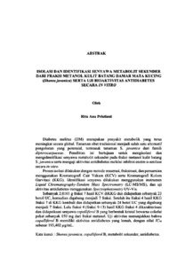 Diabetes melitus (DM) merupakan penyakit metabolik yang terus meningkat secara global. Tanaman obat tradisional menjadi salah satu alternatif pengobatan yang potensial, termasuk tanaman S. javanica dari famili dipterocarpaceae. Penelitian ini bertujuan untuk mengisolasi dan mengidentifikasi senyawa metabolit sekunder pada fraksi metanol kulit batang S. javanica serta menguji aktivitas antidiabetes melalui inhibisi enzim α-amilase secara in vitro. Proses isolasi dilakukan dengan metode maserasi, fraksinasi, dan pemurnian menggunakan Kromatografi Cair Vakum (KCV) serta Kromatografi Kolom Garvitasi (KKG). Identifikasi senyawa dilakukan menggunakan instrumen Liquid Chromatography-Tandem Mass Spectrometry (LC-MS/MS), dan uji aktivitas antidiabetes menggunakan Spectrophotometry UV-Vis. Sebanyak 2,0101 g fraksi 7 hasil KCV diKKG dan didapatkan sebanyak 23 botol UC, kemudian digabung menjadi 7 fraksi. Setelah itu fraksi 4 hasil KKG fraksi 7 di KKG kembali dan didapatkan sebanyak 24 botol UC yang digabung menjadi 7 fraksi. Lalu fraksi 4 (fraksi 9-13) hasil KKG fraksi 4 dikarakterisasi dan didapatkaan senyawa copalliferol B yang berbentuk kristal bewarna cokelat pekat sebanyak 150 mg dari fraksi metanol. Uji aktivitas menunjukkan bahwa copalliferol B memiliki aktivitas antidiabetes yang lemah, dengan nilai IC50 sebesar 193,402 μg/mL. Kata kunci : Shorea javanica, copalliferol B, metabolit sekunder, antidiabetes. Diabetes mellitus (DM) is a metabolic disease that continues to increase globally. Traditional medicinal plants, including S. javanica from the Dipterocarpaceae family, are a potential alternative treatment. This study aimed to isolate and identify secondary metabolites in the methanol fraction of S. javanica stem bark and to test their antidiabetic activity through in vitro inhibition of the α-amylase enzyme. The isolation process was carried out using maceration, fractionation, and purification methods using Vacuum Liquid Chromatography (VLC) and Gravity Column Chromatography (GCC). Compound identification was performed using Liquid Chromatography-Tandem Mass Spectrometry (LC-MS/MS), and antidiabetic activity was tested using UV-Vis Spectrophotometry. A total of 2.0101 g of fraction 7 from KCV in KKG obtained 23 bottles of UC then combined into 7 fractions, after that fraction 4 from KKG fraction 7 in KKG again and obtained 24 bottles of UC combined into 7 fractions. Then fraction 4 (fraction 9-13) from KKG fraction 4 was characterized and obtained copalliferol B compound in the form of dark brown crystals as much as 150 mg from the methanol fraction. Activity test showed that copalliferol B has weak antidiabetic activity, with an IC50 value of 193.402 μg/mL. Key words : Shorea javanica Koord. & Valeton, Copalliferol B, secondary metabolites, antidiabetic