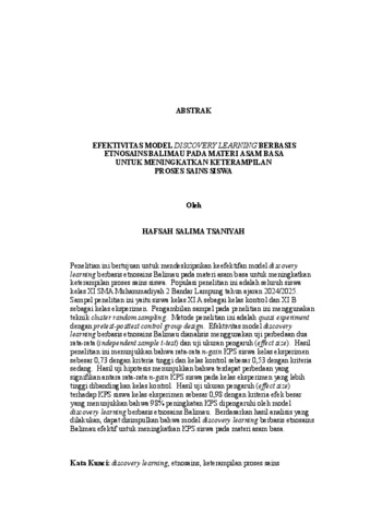 Hafsah , Salima Tsaniyah (2025) EFEKTIVITAS MODEL DISCOVERY LEARNING BERBASIS ETNOSAINS BALIMAU PADA MATERI ASAM BASA UNTUK MENINGKATKAN KETERAMPILAN PROSES SAINS SISWA. FAKULTAS KEGURUAN DAN ILMU PENDIDIKAN , UNIVERSITAS LAMPUNG.