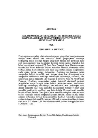 Shalsabilla , Septiani (2025) ISOLASI DAN KARAKTERISASI BAKTERI TERMOFILIK PADA KOMPOS DASAR FASE DEKOMPOSISI DI COMPOST PLANT PT. GREAT GIANT PINEAPPLE. FAKULTAS MATEMATIKA DAN ILMU PENGETAHUAN ALAM, UNIVERSITAS LAMPUNG.