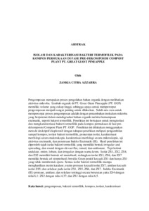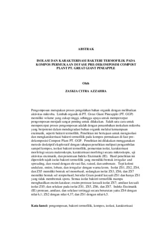 Zaskia , Citra Azzahra (2025) ISOLASI DAN KARAKTERISASI BAKTERI TERMOFILIK PADA KOMPOS PERMUKAAN DI FASE PRE-DEKOMPOSISI COMPOST PLANT PT. GREAT GIANT PINEAPPLE. FAKULTAS MATEMATIKA DAN ILMU PENGETAHUAN ALAM, UNIVERSITAS LAMPUNG.