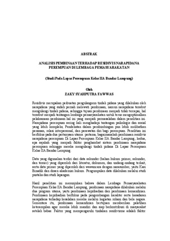 Residivis merupakan perbuatan pengulangann tindak pidana yang dilakukan oleh narapidana yang sudah pernah melewati pembinaan, namun narapidana tersebut mengulangi tindak pidana, sehingga tujuan pembinaan menjadi tidak tercapai, hal tersebut menjadi tantangan lembaga pemasyarakatan untuk terus mengoptimalkan pelaksanaan pembinaan hal ini yang menjadi permasalahan dalam penelitian ini. Narapidana perempuan sering kali menghadapi tantangan psikologis dan sosial yang lebih kompleks, Pendekatan dalam pembimbingan pun lebih melibatkan perasaan, relasi interpersonal, dan perawatan diri bagi perempuan. Penelitian ini berfokus pada dua pertanyaan utama: pertama, bagaimanakah pembinaan residivis narapidana perempuan Di Lapas Perempuan Kelas IIA Bandar Lampung; kedua, apa sajakah yang menjadi faktor penghambat sistem pembinaan narapidana perempuan sehingga mereka mengulangi tindak pidana Di Lapas Perempuan Kelas IIA Bandar Lampung. Data yang digunakan terdiri dari data sekunder (bahan hukum primer, sekunder, dan tersier) yang diperoleh dari literatur, dokumen, dan undang-undang terkait, serta data primer yang diperoleh dari wawancara dengan narasumber, yaitu Kasi Binadik dan dosen akademisi hukum. Pengumpulan data dilakukan melalui studi pustaka dan studi lapangan. Hasil penelitian ini menunjukan bahwa dalam Lembaga Pemasyarakatan Perempuan Kelas IIA Bandar Lampung, pembinaan narapidana dilakukan melalui dua program utama, yaitu pembinaan kepribadian dan pembinaan kemandirian. Pembinaan kepribadian berfokus pada pengembangan karakter serta kesadaran narapidana terhadap kesalahan mereka melalui kegiatan rohani dan bela negara. Sementara itu, pembinaan kemandirian bertujuan memberikan pelatihan keterampilan agar mereka lebih mandiri dan siap berkontribusi di masyarakat setelah bebas. Faktor yang mempengaruhi tindakan residivisme adalah faktor ZAKY SYAHPUTRA FAWWAS hukumnya sendiri, faktor penegak hukum, faktor sarana dan prasarana, faktor pandangan masyarakat, dan faktor kebudayaan. rendahnya kemampuan mengendalikan diri, masalah kesehatan mental yang tidak tertangani, dan kurangnya keyakinan atau keimanan yang dapat membuat mereka mengulangi tindakan kriminal. Saran untuk meningkatkan efektivitas pembinaan narapidana dan mengurangi residivisme, beberapa langkah penting perlu diambil. Pertama, perlu ada peningkatan program pembinaan kepribadian dan kemandirian dengan pendekatan psikologis yang lebih mendalam dan pelatihan keterampilan yang relevan dengan dunia kerja. Kedua, Lembaga Pemasyarakatan harus memperkuat dukungan dengan tenaga ahli seperti psikolog dan pelatih keterampilan yang dapat membantu narapidana dalam proses rehabilitasi terutama kepada narapidana perempuan yang memiliki mental dan pikiran yang lebih sensitif saat menjalani pembinaan. Selain itu, sosialisasi untuk mengurangi stigma terhadap mantan narapidana di masyarakat sangat penting agar mereka dapat reintegrasi dengan baik. Penegakan hukum yang adil dan konsisten juga diperlukan untuk menciptakan rasa keadilan, serta perbaikan sarana dan prasarana di lembaga pemasyarakatan untuk mendukung proses pembinaan secara optimal. Langkah- langkah ini diharapkan dapat mengurangi tingkat residivisme dan memperbaiki kualitas pembinaan bagi narapidana. Kata Kunci : Pembinaan, Residivis, Narapidana Perempuan Recidivism is the act of repeating criminal acts committed by inmates who have gone through coaching, but the inmate repeats the criminal act, so that the goal of coaching is not achieved, this is a challenge for correctional institutions to continue to optimize the implementation of coaching which is a problem in this study. Female inmates often face more complex psychological and social challenges, and the approach to counseling is more emotional, interpersonal relationships, and self- care for women. This research focuses on two main questions: first, how to foster female recidivism in the Class IIA Women's Prison in Bandar Lampung; second, what are the factors that hinder the coaching system of female inmates so that they repeat criminal acts in the Class IIA Women's Prison in Bandar Lampung. The data used consisted of secondary data (primary, secondary, and tertiary legal materials) obtained from literature, documents, and related laws, as well as primary data obtained from interviews with resource persons, namely Kasi Binadik and lecturers of legal academics. Data collection was carried out through literature studies and field studies. The results of this study show that in the Bandar Lampung Class IIA Women's Correctional Institution, inmate development is carried out through two main programs, namely personality development and independence development. Personality coaching focuses on character development and inmates' awareness of their mistakes through spiritual activities and defending the country. Meanwhile, independence coaching aims to provide skills training so that they are more independent and ready to contribute to society after being free. Factors that influence acts of recidivism are factors ABSTRACT ANALYSIS OF COACHING FOR FEMALE RECIDIVISTS IN CORRECTIONAL INSTITUTIONS (Study on Class IIA Women's Prison Bandar Lampung) By ZAKY SYAHPUTRA FAWWAS ZAKY SYAHPUTRA FAWWAS the law itself, law enforcement factors, facilities and infrastructure factors, community view factors, and cultural factors. low self-control abilities, unaddressed mental health issues, and a lack of faith or faith that can lead them to repeat criminal acts. Suggestions to improve the effectiveness of inmate coaching and reduce recidivism, some important steps need to be taken. First, there needs to be an increase in personality and independence development programs with a more in-depth psychological approach and skills training that is relevant to the world of work. Second, Correctional Institutions must strengthen support with experts such as psychologists and skill coaches who can help inmates in the rehabilitation process, especially for female inma