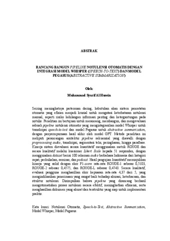 Seiring meningkatnya pertemuan daring, kebutuhan akan sistem pencatatan otomatis yang efisien menjadi krusial untuk mengatasi keterbatasan notulensi manual, seperti risiko kehilangan informasi penting dan ketergantungan pada notulis. Penelitian ini bertujuan untuk merancang, membangun, dan mengevaluasi sebuah pipeline notulensi otomatis yang mengintegrasikan model Whisper untuk transkripsi speech-to-text dan model Pegasus untuk abstractive summarization, dengan penyermpurnaan hasil akhir oleh model GPT. Metode penelitian ini meliputi perancangan arsitektur pipeline sekuensial yang diawalli dengan preproceesing audio, transkripsi, segmentasi teks, peringkasan, hingga parafrase. Kinerja sistem dievaluasi secara kuantitatif menggunakan metrik ROUGE dan secara kualitatif melalui kuesioner Likert Scale kepada 51 responden, dengan menggunakan dataset berisi 100 rekaman audio berbahasa Indonesia dari kategori rapat, perkuliahan, seminar, dan podcast. Hasil pengujian kuantitatif menunjukkan kinerja yang solid dengan skor F1-score rata-rata ROUGE-1 sebesar 0,5103, ROUGE-2 sebesar 0,4575, dan ROUGE-L sebesar 0,4743. Secara kualitatif, evaluasi pengguna menghasilkan skor kepuasan rata-rata 4,37 dari 5, yang mengindikasikan penerimaan yang sangat baik terhadap akurasi, keterbacaan, dan struktur notulensi. Disimpulkan bahwa pipeline yang dirancang berhasil mengotomatiskan proses notulensi secara efektif, meningkatkan efisiensi, serta menghasilkan dokumen yang akurat dan terstruktur yang siap untuk implementasi praktis. Kata kunci: Notulensi Otomatis, Speech-to-Text, Abstractive Summarization, Model Whisper, Model Pegasus. With the increasing number of online meetings, the need for an efficient automated recording system has become crucial to overcome the limitations of manual note-taking, such as the risk of losing important information and reliance on a human notetaker. This research aims to design, build, and evaluate an automated minutes pipeline that integrates the Whisper model for speech-to-text transcription and the Pegasus model for abstractive summarization, with final refinement by the GPT model. The research method includes designing a sequential pipeline architecture starting from audio preprocessing, transcription, text segmentation, summarization, to paraphrasing. The system's performance was evaluated quantitatively using ROUGE metrics and qualitatively through a Likert scale questionnaire distributed to 51 respondents, using a dataset of 100 Indonesian audio recordings from the categories of meetings, lectures, seminars, and podcasts. The quantitative test results show a solid performance with average F1-scores of 0.5103 for ROUGE-1, 0.4575 for ROUGE-2, and 0.4743 for ROUGE-L. Qualitatively, the user evaluation yielded an average satisfaction score of 4.37 out of 5, indicating excellent acceptance of the accuracy, readability, and structure of the minutes. It is concluded that the designed pipeline successfully automates the minute-taking process effectively, enhances efficiency, and produces accurate and structured documents ready for practical implementation. Keywords: Automated Minutes, Speech-to-Text, Abstractive Summarization, Whisper Model, Pegasus Model.