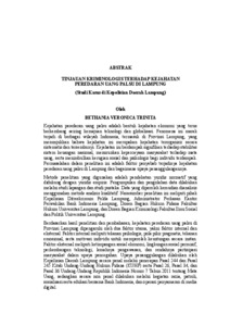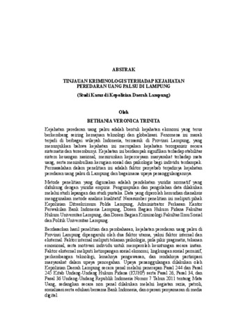 Kejahatan peredaran uang palsu adalah bentuk kejahatan ekonomi yang terus berkembang seiring kemajuan teknologi dan globalisasi. Fenomena ini marak terjadi di berbagai wilayah Indonesia, termasuk di Provinsi Lampung, yang menunjukkan bahwa kejahatan ini merupakan kejahatan terorganisir secara sistematis dan tersembunyi. Kejahatan ini berdampak signifikan terhadap stabilitas sistem keuangan nasional, menurunkan kepercayaan masyarakat terhadap mata uang, serta menimbulkan kerugian sosial dan psikologis bagi individu terdampak. Permasalahan dalam penelitian ini adalah faktor penyebab terjadinya kejahatan peredaran uang palsu di Lampung dan bagaimana upaya penanggulangannya. Metode penelitian yang digunakan adalah pendekatan yuridis normatif yang didukung dengan yuridis empiris. Pengumpulan dan pengolahan data dilakukan melalui studi lapangan dan studi pustaka. Data yang diperoleh kemudian dianalisis menggunakan metode analisis kualitatif. Narasumber penelitian ini meliputi pihak Kepolisian Ditreskrimum Polda Lampung, Administrator Perkasan Kantor Perwakilan Bank Indonesia Lampung, Dosen Bagian Hukum Pidana Fakultas Hukum Universitas Lampung, dan Dosen Bagian Kriminologi Fakultas Ilmu Sosial dan Politik Universitas Lampung. Berdasarkan hasil penelitian dan pembahasan, kejahatan peredaran uang palsu di Provinsi Lampung dipengaruhi oleh dua faktor utama, yakni faktor internal dan eksternal. Faktor internal meliputi tekanan psikologis, pola pikir pragmatis, tekanan emosional, serta motivasi individu untuk memperoleh keuntungan secara instan. Faktor eksternal meliputi ketimpangan sosial ekonomi, lingkungan sosial permisif, perkembangan teknologi, lemahnya pengawasan, dan rendahnya partisipasi masyarakat dalam upaya pencegahan. Upaya penanggulangan dilakukan oleh Kepolisian Daerah Lampung secara penal melalui penerapan Pasal 244 dan Pasal 245 Kitab Undang-Undang Hukum Pidana (KUHP) serta Pasal 26, Pasal 34, dan Pasal 36 Undang-Undang Republik Indonesia Nomor 7 Tahun 2011 tentang Mata Uang, sedangkan secara non penal dilakukan melalui kegiatan razia, patroli, sosialisasiserta edukasi bersama Bank Indonesia, dan operasi penyamaran di media digital. iii Bethania Veronica Trinita Adapun saran yang dapat diberikan oleh penulis dalam penelitian ini yaitu penguatan strategi melalui peningkatan kapasitas aparat kepolisian, pemanfaatan teknologi digital, dan pengembangan operasi penyamaran. Perlu diperluas program edukasi kepada masyarakat, khususnya di wilayah rawan, agar memiliki pengetahuan yang memadai dalam mengenali ciri-ciri uang asli dan uang palsu serta langkah-langkah yang tepat dalam menangani temuan uang palsu. Kerja sama antarlembaga juga harus ditingkatkan untuk mengoptimalkan pengawasan distribusi uang dan inovasi fitur keamanan rupiah. Kata Kunci: Kriminologi, Uang Palsu, Kepolisian Daerah Lampung Counterfeit money circulation is a form of economic crime that continues to grow with technological advances and globalization. This phenomenon is widespread in various regions of Indonesia, including Lampung Province, indicating that this crime is systematically and covertly organized. This crime has a significant impact on the stability of the national financial system, reducing public confidence in the currency, and causing social and psychological harm to affected individuals. The research question is the causes of counterfeit money circulation in Lampung and how to address it. The research method used is a normative juridical approach supported by empirical juridical. Data collection and processing were conducted through field studies and literature studies. The data obtained were then analyzed using qualitative analysis methods. The sources of this research included the Police Directorate of Criminal Investigation of the Lampung Regional Police, the Administrator of the Filing Office of the Bank Indonesia Lampung Representative Office, a lecturer in the Criminal Law Department of the Faculty of Law, University of Lampung, and a lecturer in the Criminology Department of the Faculty of Social and Political Sciences, University of Lampung. Based on the results of research and discussion, the crime of counterfeit money circulation in Lampung Province is influenced by two main factors, namely internal and external factors. Internal factors include psychological pressure, pragmatic mindset, emotional pressure, and individual motivation to obtain instant profits. External factors include socioeconomic inequality, permissive social environment, technological development, weak supervision, and low community participation in prevention efforts. Countermeasures are carried out by the Lampung Regional Police through a penal approach through the application of Article 244 and Article 245 of the Criminal Code (KUHP) and Article 26, Article 34, and Article 36 of the Republic of Indonesia Law Number 7 of 2011 concerning Currency, while non- penal measures are carried out through raids, patrols, socialization and education with Bank Indonesia, and undercover operations in digital media. v Bethania Veronica Trinita The authors' suggestions for this study include strengthening strategies through increased police capacity, utilizing digital technology, and developing undercover operations. Public education programs, particularly in vulnerable areas, should be expanded to provide them with adequate knowledge to identify genuine and counterfeit currency and the appropriate steps to take when handling counterfeit currency. Inter-agency cooperation should also be strengthened to optimize oversight of currency distribution and innovate rupiah security features. Keywords: Criminology, Counterfeit Money, Lampung Regional Police