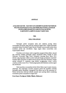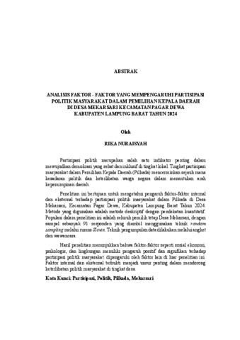 Partisipasi politik merupakan salah satu indikator penting dalam mewujudkan demokrasi yang sehat dan inklusif di tingkat lokal. Tingkat partisipasi masyarakat dalam Pemilihan Kepala Daerah (Pilkada) mencerminkan sejauh mana kesadaran politik dan keterlibatan warga negara dalam menentukan arah kepemimpinan daerah. Penelitian ini bertujuan untuk mengetahui pengaruh faktor-faktor internal dan eksternal terhadap partisipasi politik masyarakat dalam Pilkada di Desa Mekarsari, Kecamatan Pagar Dewa, Kabupaten Lampung Barat Tahun 2024. Metode yang digunakan adalah metode deskriptif dengan pendekatan kuantitatif. Populasi dalam penelitian ini adalah seluruh pemilih tetap Desa Mekarsari, dengan sampel sebanyak 91 responden yang diambil menggunakan teknik random sampling melalui rumus Slovin. Teknik pengumpulan data dilakukan melalui angket dan wawancara. Hasil penelitian menunjukkan bahwa faktor-faktor seperti sosial ekonomi, psikologis, dan lingkungan memiliki pengaruh positif dan signifikan terhadap partisipasi politik masyarakat. dipengaruhi oleh faktor lain di luar penelitian ini. Faktor internal dan eksternal terbukti menjadi unsur penting dalam mendorong keterlibatan politik masyarakat di tingkat desa. Kata Kunci: Partisipasi, Politik, Pilkada, Mekarsari ANALYSIS OF FACTORS AFFECTING PUBLIC POLITICAL PARTICIPATION IN LOCAL HEAD ELECTIONS IN MEKARSARI VILLAGE, PAGAR DEWA DISTRICT WEST LAMPUNG REGENCY IN 2024 By RIKA NURAISYAH Political participation is one of the key indicators in achieving healthy and inclusive democracy at the local level. The level of community participation in Local Elections (Pilkada) reflects the extent of political awareness and citizen engagement in determining the direction of local leadership. This study aims to determine the influence of internal and external factors on community political participation in the Pilkada in Mekarsari Village, Pagar Dewa Subdistrict, West Lampung Regency in 2024. The method used is a descriptive method with a quantitative approach. The population in this study is all registered voters in Mekarsari Village, with a sample of 91 respondents selected using random sampling techniques based on the Slovin formula. Data collection techniques were conducted through questionnaires and interviews. The results of the study indicate that factors such as socioeconomic, psychological, and environmental factors have a positive and significant influence on community political participation. These factors are influenced by other factors outside the scope of this study. Internal and external factors have proven to be important elements in encouraging community political involvement at the village level. Keywords: Participation, Politics, Local Elections, Mekarsari