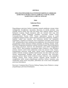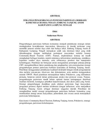 SUDARMAN , MERSA (2025) STRATEGI PENGEMBANGAN POTENSI PARIWISATA BERBASIS KOMUNITAS DI DESA WISATA EMBUNG TANJUNG ANOM KABUPATEN LAMPUNG TENGAH. [Disertasi]