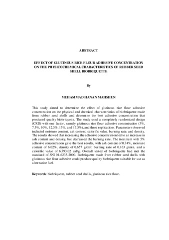 Penelitian ini bertujuan untuk mengetahui pengaruh konsentrasi perekat tepung beras ketan terhadap karakteristik fisik dan kimia biobriket dari cangkang biji karet serta menentukan konsentrasi perekat terbaik yang menghasilkan biobriket berkualitas. Penelitian ini menggunakan Rancangan Acak Lengkap (RAL) dengan satu faktor, yaitu konsentrasi perekat tepung beras ketan (5%, 7,5%, 10%, 12,5%, 15%, dan 17,5%) dan tiga kali ulangan. Parameter yang diamati meliputi kadar air, kadar abu, nilai kalor, laju pembakaran, dan kerapatan. Hasil penelitian menunjukkan bahwa peningkatan konsentrasi perekat menyebabkan peningkatan kadar abu dan kerapatan, namun menurunkan laju pembakaran. Perlakuan dengan konsentrasi perekat 5% memberikan hasil terbaik dengan kadar abu (0,74%), kadar air (6,02%), nilai kerapatan (0,657 g/cm3 ), laju pembakaran (0,163 g/menit), dan nilai kalor sebesar 6.793,02 kal/g. Uji keseluruhan biobriket telah memenuhi standar SNI 01-6235-2000. Biobriket berbahan dasar cangkang biji karet dengan perekat tepung beras ketan menghasilkan biobriket berkualitas yang layak digunakan sebagai bahan bakar alternatif. Kata kunci: biobriket, cangkang biji karet, tepung beras ketan. This study aimed to determine the effect of glutinous rice flour adhesive concentration on the physical and chemical characteristics of biobriquette made from rubber seed shells and determine the best adhesive concentration that produced quality biobriquette. The study used a completely randomized design (CRD) with one factor, namely glutinous rice flour adhesive concentration (5%, 7.5%, 10%, 12.5%, 15%, and 17.5%), and three replications. Parameters observed included moisture content, ash content, calorific value, burning rate, and density. The results showed that increasing the adhesive concentration led to an increase in ash content and density, but decreased the burning rate. The treatment with 5% adhesive concentration gave the best results, with ash content of 0.74%, moisture content of 6.02%, density of 0.657 g/cm3, burning rate of 0.163 g/min, and a calorific value of 6,793.02 cal/g. Overall tested of biobriquette had met the standard of SNI 01-6235-2000. Biobriquette made from rubber seed shells with glutinous rice flour adhesive could produce quality biobriquette suitable