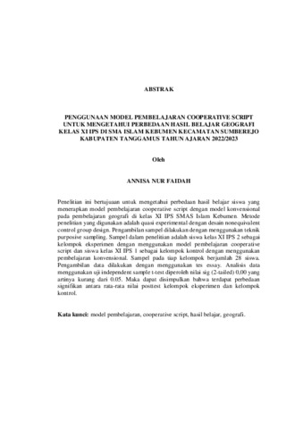 Annisa Nur Faidah, - (2025) PENGGUNAAN MODEL PEMBELAJARAN COOPERATIVE SCRIPT UNTUK MENGETAHUI PERBEDAAN HASIL BELAJAR GEOGRAFI KELAS XI IPS DI SMA ISLAM KEBUMEN KECAMATAN SUMBEREJO KABUPATEN TANGGAMUS TAHUN AJARAN 2022/2023. FAKULTAS KEGURUAN DAN ILMU PENDIDIKAN, UNIVERSITAS LAMPUNG.
