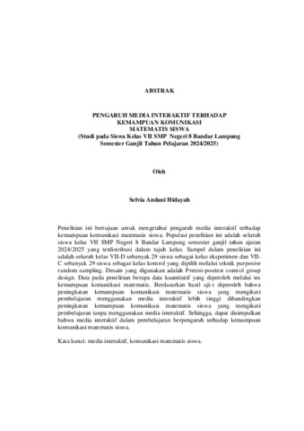 Penelitian ini bertujuan untuk mengetahui pengaruh media interaktif terhadap kemampuan komunikasi matematis siswa. Populasi penelitian ini adalah seluruh siswa kelas VII SMP Negeri 8 Bandar Lampung semester ganjil tahun ajaran 2024/2025 yang terdistribusi dalam tujuh kelas. Sampel dalam penelitian ini adalah seluruh kelas VII-D sebanyak 29 siswa sebagai kelas eksperimen dan VII- C sebanyak 29 siswa sebagai kelas kontrol yang dipilih melalui teknik purposive random sampling. Desain yang digunakan adalah Pretest-posttest control group design. Data pada penelitian berupa data kuantitatif yang diperoleh melalui tes kemampuan komunikasi matematis. Berdasarkan hasil uji-t diperoleh bahwa peningkatan kemampuan komunikasi matematis siswa yang mengikuti pembelajaran menggunakan media interaktif lebih tinggi dibandingkan peningkatan kemampuan komunikasi matematis siswa yang mengikuti pembelajaran tanpa menggunakan media interaktif. Sehingga, dapat disimpulkan bahwa media interaktif dalam pembelajaran berpengaruh terhadap kemampuan komunikasi matematis siswa. Kata kunci: media interaktif, komunikasi matematis siswa. This study aims to determine the effect of interactive media on students' mathematical communication skills. The population of this study were all seventh grade students of SMP Negeri 8 Bandar Lampung in the odd semester of the 2024/2025 school year distributed in seven classes. The samples in this study were the entire VII-D class of 29 students as the experimental class and VII-C of 29 students as the control class selected through purposive random sampling technique. The design used was Pretest-posttest control group design. The data in the study in the form of quantitative data obtained through mathematical communication ability tests. Based on the results of the t-test, it was found that the increase in mathematical communication skills of students who took part in learning using interactive media was higher than the increase in mathematical communication skills of students who took part in learning without using interactive media. Thus, it can be concluded that interactive media in learning has an effect on students' mathematical communication skills. Keywords: interactive media, student mathematical communication