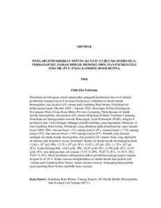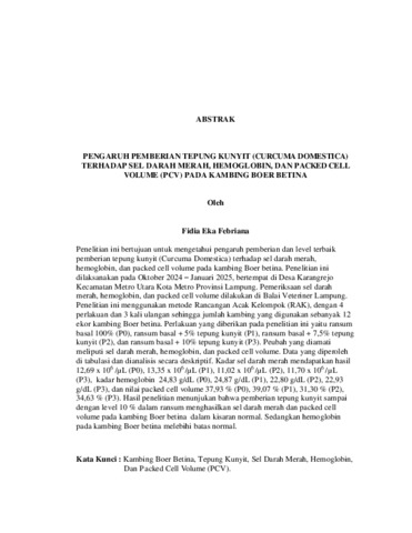 Penelitian ini bertujuan untuk mengetahui pengaruh pemberian dan level terbaik pemberian tepung kunyit (Curcuma Domestica) terhadap sel darah merah, hemoglobin, dan packed cell volume pada kambing Boer betina. Penelitian ini dilaksanakan pada Oktober 2024 – Januari 2025, bertempat di Desa Karangrejo Kecamatan Metro Utara Kota Metro Provinsi Lampung. Pemeriksaan sel darah merah, hemoglobin, dan packed cell volume dilakukan di Balai Veteriner Lampung. Penelitian ini menggunakan metode Rancangan Acak Kelompok (RAK), dengan 4 perlakuan dan 3 kali ulangan sehingga jumlah kambing yang digunakan sebanyak 12 ekor kambing Boer betina. Perlakuan yang diberikan pada penelitian ini yaitu ransum basal 100% (P0), ransum basal + 5% tepung kunyit (P1), ransum basal + 7,5% tepung kunyit (P2), dan ransum basal + 10% tepung kunyit (P3). Peubah yang diamati meliputi sel darah merah, hemoglobin, dan packed cell volume. Data yang diperoleh di tabulasi dan dianalisis secara deskriptif. Kadar sel darah merah mendapatkan hasil 12,69 x 106 /μL (P0), 13,35 x 106 /μL (P1), 11,02 x 106 /μL (P2), 11,70 x 106 /μL (P3), kadar hemoglobin 24,83 g/dL (P0), 24,87 g/dL (P1), 22,80 g/dL (P2), 22,93 g/dL (P3), dan nilai packed cell volume 37,93 % (P0), 39,07 % (P1), 31,30 % (P2), 34,63 % (P3). Hasil penelitian menunjukan bahwa pemberian tepung kunyit sampai dengan level 10 % dalam ransum menghasilkan sel darah merah dan packed cell volume pada kambing Boer betina dalam kisaran normal. Sedangkan hemoglobin pada kambing Boer betina melebihi batas normal. Kata Kunci : Kambing Boer Betina, Tepung Kunyit, Sel Darah Merah, Hemoglobin, Dan Packed Cell Volume (PCV). This study aims to determine the effect and level of effect of the best turmeric (Curcuma Domestica) flour on red blood cells, hemoglobin, and packed cell volume in female Boer goats. This study was conducted in October 2024 - January 2025, located in Karangrejo Village, Metro Utara District, Metro City, Lampung Province. Examination of red blood cells, hemoglobin, and packed cell volume was carried out at the Lampung Veterinary Center. This study used the Randomized Block Design (RAK) method, with 4 treatments and 3 replications so that the number of goats used was 12 female Boer goats. The treatments given in this study were 100% basal ration (P0), basal ration + 5% turmeric flour (P1), basal ration + 7.5% turmeric flour (P2), and basal ration + 10% turmeric flour (P3). The variables observed included red blood cells, hemoglobin, and packed cell volume. The data obtained were tabulated and analyzed descriptively. The red blood cell levels obtained results of 12.69 x 106/μL (P0), 13.35 x 106/μL (P1), 11.02 x 106/μL (P2), 11.70 x 106/μL (P3), hemoglobin levels 24.83 g/dL (P0), 24.87 g/dL (P1), 22.80 g/dL (P2), 22.93 g/dL (P3), and packed cell volume values 37.93% (P0), 39.07% (P1), 31.30% (P2), 34.63% (P3). The results showed that the administration of turmeric flour up to 10% in the ration produced red blood cells and packed cell volume in female Boer goats within the normal range. While hemoglobin in female Boer goats exceeded the normal limit. Keywords : Female boer goat, turmeric flour, red blood cells, hemoglobin, and packed cell volum (PCV)