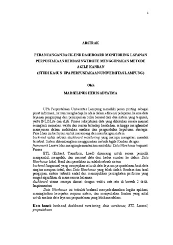 UPA Perpustakaan Universitas Lampung memiliki peran penting sebagai pusat informasi, namun menghadapi kendala dalam efisiensi pelaporan karena data layanan pengunjung dan peminjaman buku berasal dari dua sistem yang terpisah, yaitu INLISLite dan eLib. Proses rekapitulasi data yang dilakukan secara manual seringkali memakan waktu dan rentan terhadap kesalahan, sehingga menghambat manajemen dalam melakukan analisis dan pengambilan keputusan strategis. Penelitian ini bertujuan untuk merancang dan membangun sistem back-end untuk sebuah dashboard monitoring yang mampu mengatasi masalah tersebut. Sistem dikembangkan menggunakan metode Agile Kanban dengan framework Laravel dan mengimplementasikan arsitektur Data Warehouse terpusat. Proses ETL (Extract, Transform, Load) dirancang untuk secara periodik mengambil, mengolah, dan memuat data dari kedua sumber ke dalam Data Warehouse lokal. Hasil dari penelitian ini adalah sebuah sistem backend fungsional yang menyajikan seluruh data layanan perpustakaan, baik data ringkas maupun detail, dari Data Warehouse yang telah diolah. Berdasarkan hasil pengujian, sistem terbukti andal dan menunjukkan peningkatan performa yang sangat signifikan, di mana semua halaman dashboard utama mampu dimuat dengan waktu rata-rata di bawah 2 detik. Implementasi Data Warehouse ini terbukti berhasil menyederhanakan logika aplikasi, meningkatkan kecepatan respons sistem, dan menyediakan fondasi yang solid untuk analisis data layanan perpustakaan yang lebih mendalam. Kata kunci: back-end, dashboard monitoring, data warehouse, ETL, Laravel, perpustakaan The UPA Library of Universitas Lampung plays a crucial role as an information center, yet it faces challenges in reporting efficiency because service data for visitors and book loans originate from two separate systems: INLISLite and eLib. The manual data recapitulation process is often time-consuming and prone to errors, hindering management from performing strategic analysis and decision- making. This research aims to design and develop a back-end system for a monitoring dashboard capable of overcoming these issues. The system was developed using the Agile Kanban method with the Laravel framework and implements a centralized Data Warehouse architecture. An ETL (Extract, Transform, Load) process was designed to periodically extract, transform, and load data from both sources into a local Data Warehouse. The result of this research is a functional back-end system that serves all library service data, both summary and detailed, from the processed Data Warehouse. Based on testing results, the system proved to be reliable and demonstrated a very significant performance improvement, with all main dashboard pages loading in under 2 seconds on average. This Data Warehouse implementation has successfully simplified application logic, improved system response speed, and provided a solid foundation for more in-depth analysis of library service data. Keywords: back-end, monitoring dashboard, data warehouse, ETL, Laravel, library