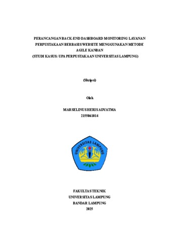 MARSELINUS , HERIS ADYATMA (2025) PERANCANGAN BACK-END DASHBOARD MONITORING LAYANAN PERPUSTAKAAN BERBASIS WEBSITE MENGGUNAKAN METODE AGILE KANBAN (STUDI KASUS: UPA PERPUSTAKAAN UNIVERSITAS LAMPUNG). FAKULTAS TEKNIK, UNIVERSITAS LAMPUNG.