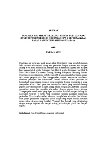 Penelitian ini bertujuan untuk mengetahui faktor-faktor yang melatarbelakangi hobi bermain adu merpati kolong dan perjudian dengan perantara adu merpati kolong serta untuk menjelaskan dampak dari pelaksanaan kegiatan adu merpati bagi masyarakat di sekitar Kolongan New Golf di sekitar Kolongan New Golf di Desa Sabah Balau Kecamatan Tanjung Bintang Kabupaten Lampung Selatan. Penelitian ini menggunakan metode kualitatif dengan pendekatan fenomenologi, dan proses pengumpulan data menggunakan metode wawancara mendalam, observasi partisipan dan dokumentasi. Jumlah infoman dalam penelitian ini berjumlah 8 orang dengan rincian 3 orang penghobi, 3 orang penjudi dan 2 orang masyarakat sekitar. Hasil penelitian menunjukan faktor yang melatarbelakangi pigeon lovers bermain adu merpati kolong adalah sebagai hobi, aktivitas ekonomi, meredakan stress dan menjalin silaturahmi dengan pigeon lovers lainnya. Terdapat pula modal sosial yang diperlukan dalam hobi adu merpati kolong ini. Kemudian terdapat 4 faktor yang mendasari penjudi pinggiran melakukan pertaruhan faktor tersebut adalah: ekonomi, iseng belaka, adrenalin, dan hiburan. Para pelaku pertaruhan mengalami proses belajar yang terjadi melalui interaksi secara intens dengan orang terdekat. Terdapat dua dampak yang ditimbulkan dengan adanya kegiatan adu merpati kolong yaitu dampak positif dan dampak negatif. Kata Kunci: Joki, Modal Sosial, Asosiasi Diferensial This study aims to explore the factors behind the hobby of participating in loft pigeon competitions and the practice of gambling through these competitions, as well as to explain the impact of such activities on the community around Kolongan New Golf in Sabah Balau Village, Tanjung Bintang Subdistrict, South Lampung Regency. The research employs a qualitative method with a phenomenological approach, and data collection was carried out through in- depth interviews, participant observation, and documentation. The study involved eight informants, consisting of 3 pigeon hobbyists, 3 gamblers, and 2 local residents. The findings indicate that the motivations for pigeon lovers to engage in loft pigeon competitions include hobby, economic activity, stress relief, and fostering social connections with fellow enthusiasts. Social capital also plays a significant role in sustaining this hobby. Additionally, four factors were identified as driving peripheral gamblers to place bets: economic needs, mere curiosity, adrenaline, and entertainment. These gambling behaviors are often learned through intense interactions with close individuals. The study reveals that the practice of loft pigeon competitions generates both positive and negative impacts on the surrounding community. Keywords: Jockey, Social Capital, Differential Association