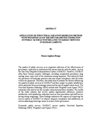 Damai , Angkasa Bunga (2025) PENERAPAN METODE STRUCTURAL EQUATION MODELING DENGAN ESTIMASI PARAMETER WEIGHTED LEAST SQUARE TERHADAP KEPUASAN MASYARAKAT TERKAIT PELAYANAN SAMSAT BANDAR LAMPUNG. FAKULTAS MATEMATIKA DAN ILMU PENGETAHUAN ALAM, UNIVERSITAS LAMPUNG.
