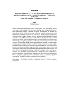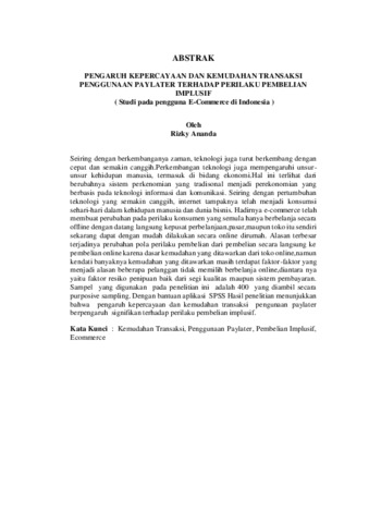 Seiring dengan berkembanganya zaman, teknologi juga turut berkembang dengan cepat dan semakin canggih.Perkembangan teknologi juga mempengaruhi unsur�unsur kehidupan manusia, termasuk di bidang ekonomi.Hal ini terlihat dari berubahnya sistem perkenomian yang tradisonal menjadi perekonomian yang berbasis pada teknologi informasi dan komunikasi. Seiring dengan pertumbuhan teknologi yang semakin canggih, internet tampaknya telah menjadi konsumsi sehari-hari dalam kehidupan manusia dan dunia bisnis. Hadirnya e-commerce telah membuat perubahan pada perilaku konsumen yang semula hanya berbelanja secara offline dengan datang langsung kepusat perbelanjaan,pasar,maupun toko itu sendiri sekarang dapat dengan mudah dilakukan secara online dirumah. Alasan terbesar terjadinya perubahan pola perilaku pembelian dari pembelian secara langsung ke pembelian online karena dasar kemudahan yang ditawarkan dari toko online,namun kendati banyaknya kemudahan yang ditawarkan masih terdapat faktor-faktor yang menjadi alasan beberapa pelanggan tidak memilih berbelanja online,diantara nya yaitu faktor resiko penipuan baik dari segi kualitas maupun sistem pembayaran. Sampel yang digunakan pada penelitian ini adalah 400 yang diambil secara purposive sampling. Dengan bantuan aplikasi SPSS Hasil penelitian menunjukkan bahwa pengaruh kepercayaan dan kemudahan transaksi pengunaan paylater berpengaruh signifikan terhadap perilaku pembelian implusif. Kata Kunci : Kemudahan Transaksi, Penggunaan Paylater, Pembelian Implusif, Ecommerce As time goes by, technology also develops rapidly and becomes more sophisticated. Technological developments also influence elements of human life, including the economic sector. This can be seen from the change in the traditional economic system to an economy based on information and communication technology. Along with the growth of increasingly sophisticated technology, the internet seems to have become everyday consumption in human life and the business world. The presence of e-commerce has made a change in consumer behavior. Previously they only shopped offline by coming directly to shopping centers, markets or the shops themselves, now they can easily do it online at home. The biggest reason for the change in purchasing behavior patterns from direct purchases to online purchases is because of the convenience offered by online stores, but despite the many conveniences offered there are still factors that are the reason why some customers do not choose to shop online, including the risk factor of fraud. in terms of quality and payment system. Paylater has the same function as a credit card, the advantage offered by this technology is that registering is relatively easy compared to a credit card. Like credit cards, paylater can make it easier for consumers to fulfill all their needs, from shopping for primary needs to entertainment such as purchasing plane tickets, hotel reservations, recreation tickets, and others, then users can pay at each predetermined due date. The sample used in this research was 400 taken by purposive sampling. With the help of the SPSS application, the research results show that the influence of trust and ease of transactions using paylater has a significant effect on impulsive purchasing behavior. Keywords : Ease of Transactions, Use of Paylater, Impulsive Purchases, Ecommerce
