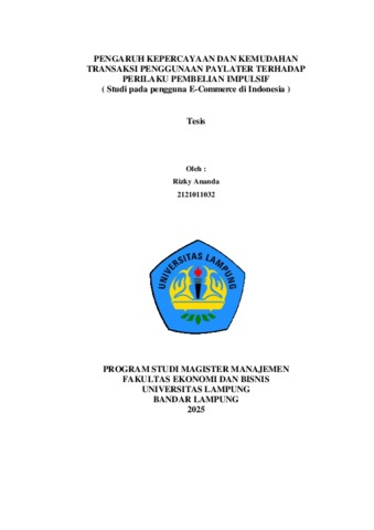 Rizky Ananda , - (2025) PENGARUH KEPERCAYAAN DAN KEMUDAHAN TRANSAKSI PENGGUNAAN PAYLATER TERHADAP PERILAKU PEMBELIAN IMPULSIF ( Studi pada pengguna E-Commerce di Indonesia ). Masters thesis, UNIVERSITAS LAMPUNG.