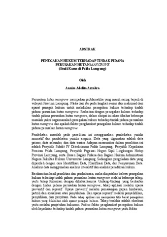 Perusakan hutan mangrove merupakan problematika yang masih sering terjadi di wilayah Provinsi Lampung. Maka dari itu perlu langkah serius dan maksimal dari aparat penegak hukum untuk melakukan penegakan hukum terhadap tindak pidana perusakan hutan mangrove. Berkaitan dengan penegakan hukum terhadap tindak pidana perusakan hutan mangrove, dalam skripsi ini akan dibahas beberapa masalah yakni bagaimanakah penegakan hukum terhadap tindak pidana perusakan hutan mangrove dan apakah faktor penghambat penegakan hukum terhadap tindak pidana perusakan hutan mangrove. Pendekatan masalah pada penelitian ini menggunakan pendekatan yuridis normatif dan pendekatan yuridis empiris. Data yang digunakan adalah data primer, data sekunder, dan data tersier. Adapun narasumber dalam penelitian ini adalah Penyidik Subdit IV Ditrekrimsus Polda Lampung, Penyidik Kepolisian Perairan Polda Lampung, Penyidik Pegawai Negeri Sipil Lingkungan Hidup Provinsi Lampung, serta Dosen Bagian Pidana dan Bagian Hukum Administrasi Negara Fakultas Hukum Universitas Lampung. Sedangkan pengolahan data yang diperoleh dengan cara Identifikasi Data, Klasifikasi Data, dan Penyusunan Data. Analisis data menggunakan analisis interaktif dan analisis penafsiran hukum. Berdasarkan hasil penelitian dan pembahasan, maka dinyatakan bahwa penegakan hukum terhadap tindak pidana perusakan hutan mangrove melalui beberapa tahap, yaitu tahap formulasi dengan dikeluarkannya Undang-Undang yang berkaitan dengan tindak pidana perusakan hutan mangrove, tahap aplikasi melalui upaya preventif dan represif. Upaya preventif melalui pemasangan papan himbauan, patroli dan sosialisasi atau penyuluhan. Dan upaya represif melalui penyelidikan, penyidikan, dan penyitaan. Pada tahap aplikasi ini merupakan titik berat penegakan hukum yang dilakukan oleh aparat penegak hukum. Tahap terakhir adalah eksekusi yaitu melalui penjatuhan hukuman. Faktor-faktor penghambat penegakan hukum oleh kepolisian terhadap tindak pidana perusakan hutan mangrove yaitu faktor Annisa Adelita Azzahra penegak hukum, tidak memadainya sarana dan prasarana, kurangnya kesadaran masyarakat, dan kebiasaan masyarat. Adapun saran yang dapat penulis sampaikan, yaitu kepolisian diharapkan dapat berkolaborasi dengan masyarakat setempat untuk meningkatkan kesadaran akan pentingnya pelestarian hutan mangrove. Kepolisian juga diharapkan untuk meningkatkan upaya pengawasan terhadap hutan mangrove dengan melakukan operasi khusus. Dan terakhir, pemerintah perlu meningkatkan sarana dan prasarana. Kata Kunci: Penegakan Hukum, Tindak Pidana, Hutan Mangrove. Mangrove forest destruction is a problem that is still common in Lampung Province. Therefore, serious and maximum steps are needed from law enforcement officers to enforce the law against criminal acts of mangrove forest destruction. In relation to law enforcement against criminal acts of mangrove forest destruction, this thesis will discuss several problems, namely how is the law enforced against criminal acts of mangrove forest destruction and what are the inhibiting factors for law enforcement against criminal acts of mangrove forest destruction. The problem approach in this study uses a normative legal approach and an empirical legal approach. The data used are primary data, secondary data, and tertiary data. The sources in this study are Investigators of Subdit IV Ditrekrimsus Polda Lampung, Investigators of the Lampung Police Water Police, Investigators of the Lampung Province Environmental Civil Servant, and Lecturers of the Criminal and State Administrative Law Sections of the Faculty of Law, University of Lampung. While the processing of data obtained by means of Data Identification, Data Classification, and Data Compilation. Data analysis uses interactive analysis and legal interpretation analysis. Based on the results of the research and discussion, it is stated that law enforcement against criminal acts of mangrove forest destruction goes through several stages, namely the formulation stage by issuing a law relating to criminal acts of mangrove forest destruction, the application stage through preventive and repressive efforts. Preventive efforts through the installation of warning boards, patrols and socialization or counseling. And repressive efforts through investigation, inquiry, and confiscation. This application stage is the focus of law enforcement carried out by law enforcement officers. The last stage is execution, namel through sentencing. Factors inhibiting law enforcement by the police against criminal acts of mangrove forest destruction are law enforcement factors, Annisa Adelita Azzahra inadequate facilities and infrastructure, lack of public awareness, and community habits. The suggestions that the author can convey are that the police are expected to collaborate with the local community to raise awareness of the importance of preserving mangrove forests. The police are also expected to increase efforts to monitor mangrove forests by conducting special operations. And finally, the government needs to improve facilities and infrastructure. Keywordsi: Law enforcement, Crime, Mangrove Forest.