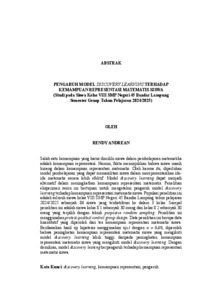 Salah satu kemampuan yang harus dimiliki siswa dalam pembelajaran matematika adalah kemampuan representasi. Namun, fakta menunjukkan bahwa siswa masih kurang dalam kemampuan representasi matematis. Oleh karena itu, diperlukan model pembelajaran yang dapat memasilitasi siswa dalam merepresentasikan ide- ide matematis secara lebih efektif. Model discovery learning dapat menjadi alternatif dalam meningkatkan kemampuan representasi matematis. Penelitian eksperimen semu ini bertujuan untuk mengetahui pengaruh model discovery learning terhadap kemampuan representasi matematis siswa. Populasi penelitian ini adalah seluruh siswa kelas VIII SMP Negeri 45 Bandar Lampung tahun pelajaran 2024/2025 sebanyak 86 siswa yang terdistribusi ke dalam 3 kelas. Sampel penelitian ini adalah siswa kelas 8.1 sebanyak 30 orang dan kelas 8.2 sebanyak 30 orang yang terpilih dengan teknik purposive random sampling. Penelitian ini menggunakan pretest-posttest control group design. Data penelitian ini berupa data kuantitatif yang diperoleh dari tes kemampuan representasi matematis siswa. Berdasarkan hasil uji hipotesis menggunakan uji-t dengan α = 0,05, diperoleh bahwa peningkatan kemampuan representasi matematis siswa yang mengikuti model discovery learning lebih tinggi daripada peningkatan kemampuan representasi matematis siswa yang mengikuti model discovery learning. Dengan demikian, model discovery leaning berpengaruh terhadap kemampuan representasi matematis siswa. Kata Kunci: discovery learning, kemampuan representasi, pengaruh One of the abilities that students must have in learning mathematics is representation ability. However, fact show that students are still lacking in mathematical representation skills. Therefore, a learning model that can facilitate students in representing mathematical ideas more effectively is needed. The discovery learning model can be an alternative in improving mathematical representation skills. This pseudo-experimental research aims to determine the effect of discovery learning model on students' mathematical representation ability. The population of this study were all VIII grade students of SMP Negeri 45 Bandar Lampung in the 2024/2025 academic year as many as 86 students distributed into 3 classes. The samples of this study were class 8.1 students as many as 30 people and class 8.2 as many as 30 people selected by purpusive random sampling technique. This study used a pretest-posttest control group design. The data of this research is quantitative data obtained from the test of students' mathematical representation ability. Based on the results of hypothesis testing using t-test with α=0.05, it was found that the improvement of mathematical representation ability of students who followed the discovery learning model was higher than the improvement of mathematical representation ability of students who followed the discovery learning model. Thus, the discovery learning model has an effect on students' mathematical representation ability. Keyword: discovery learning, effect, mathematical representation